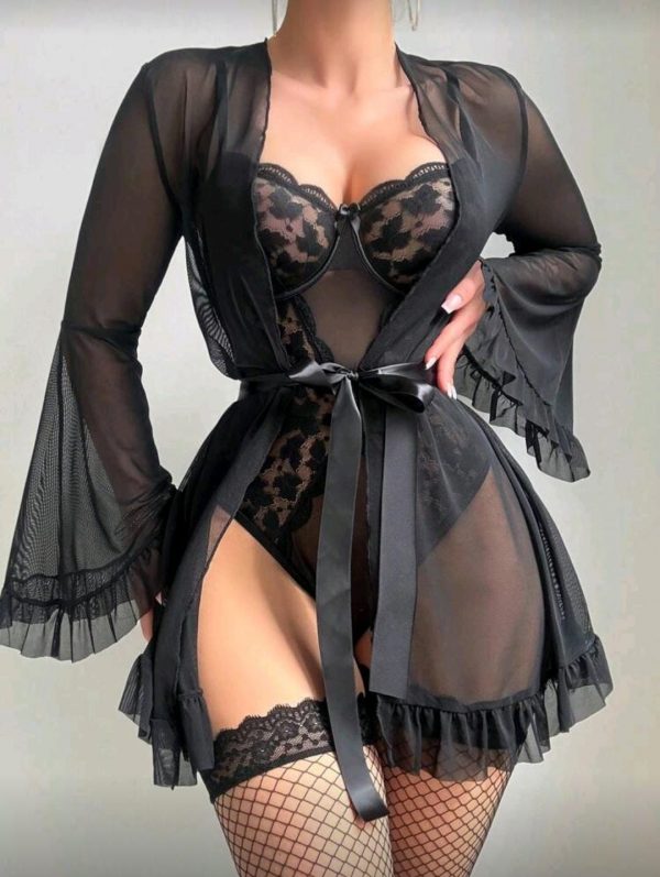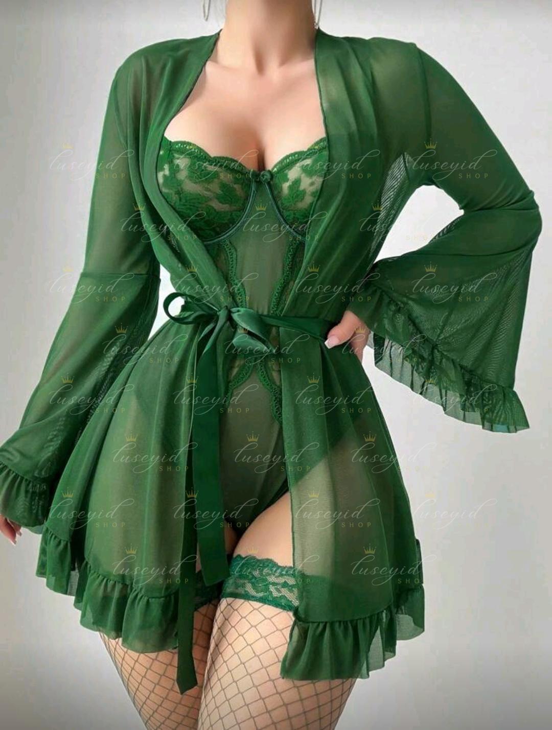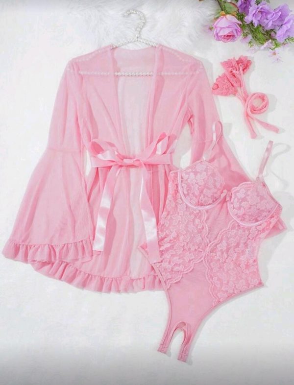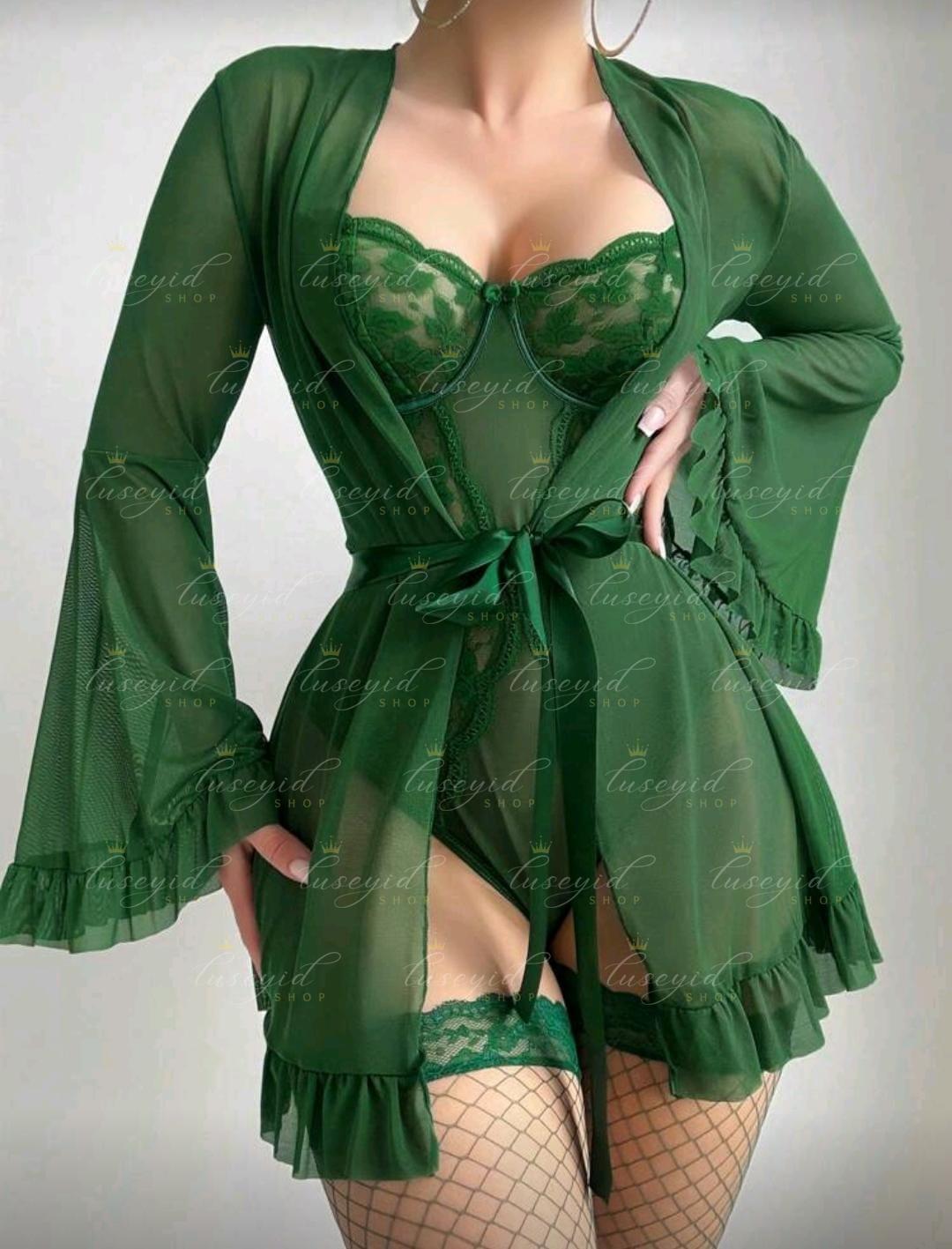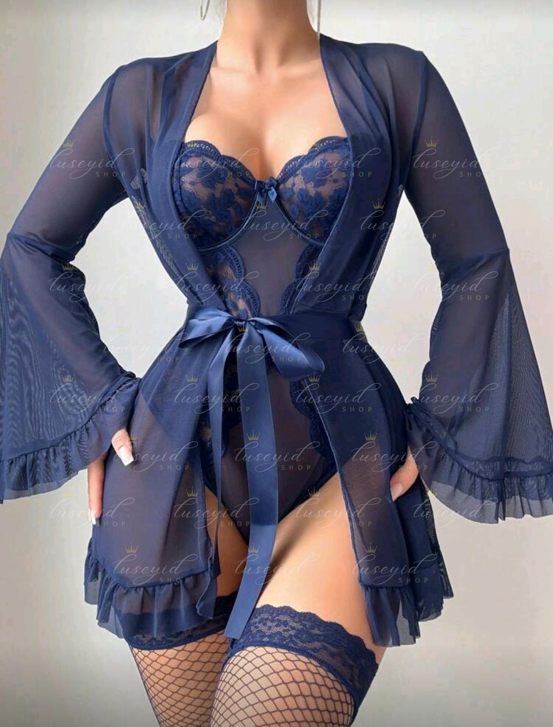 Set de 5 piezas: Body con abertura sexy + Bata + Cinturón + 1 par de medias para salir
