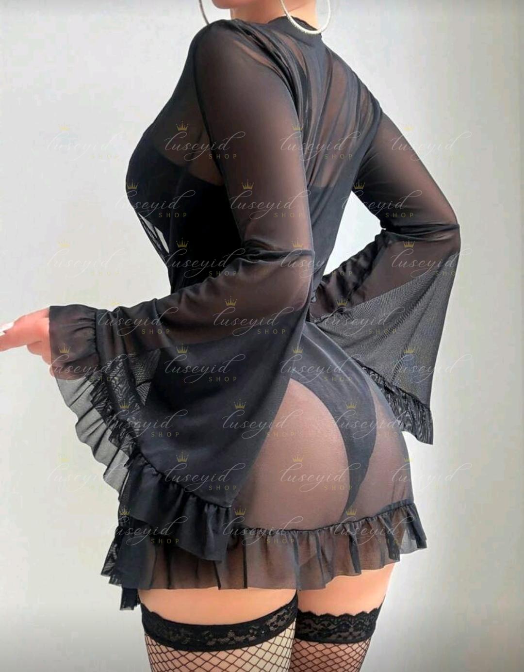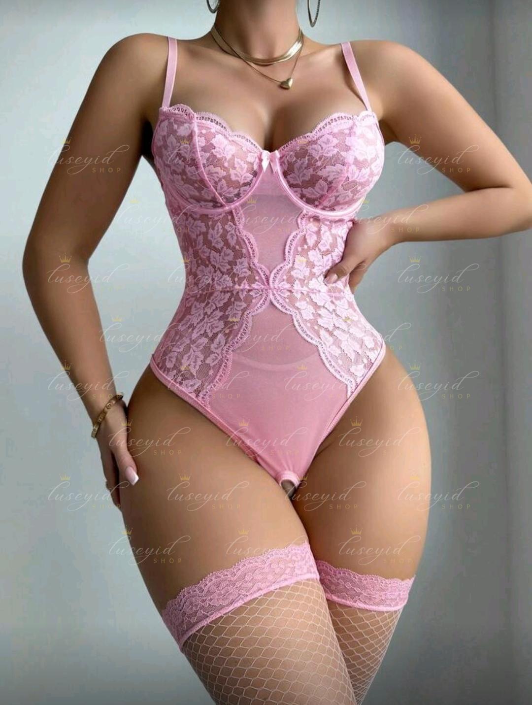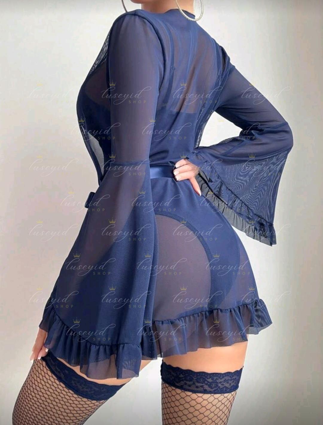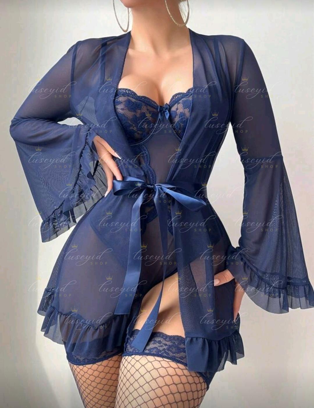 Set de 5 piezas: Body con abertura sexy + Bata + Cinturón + 1 par de medias para salir