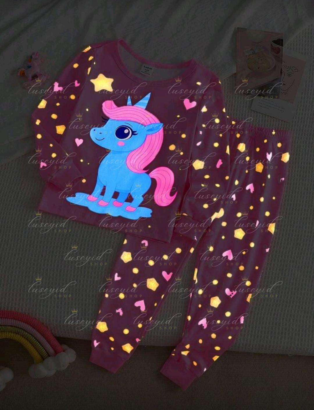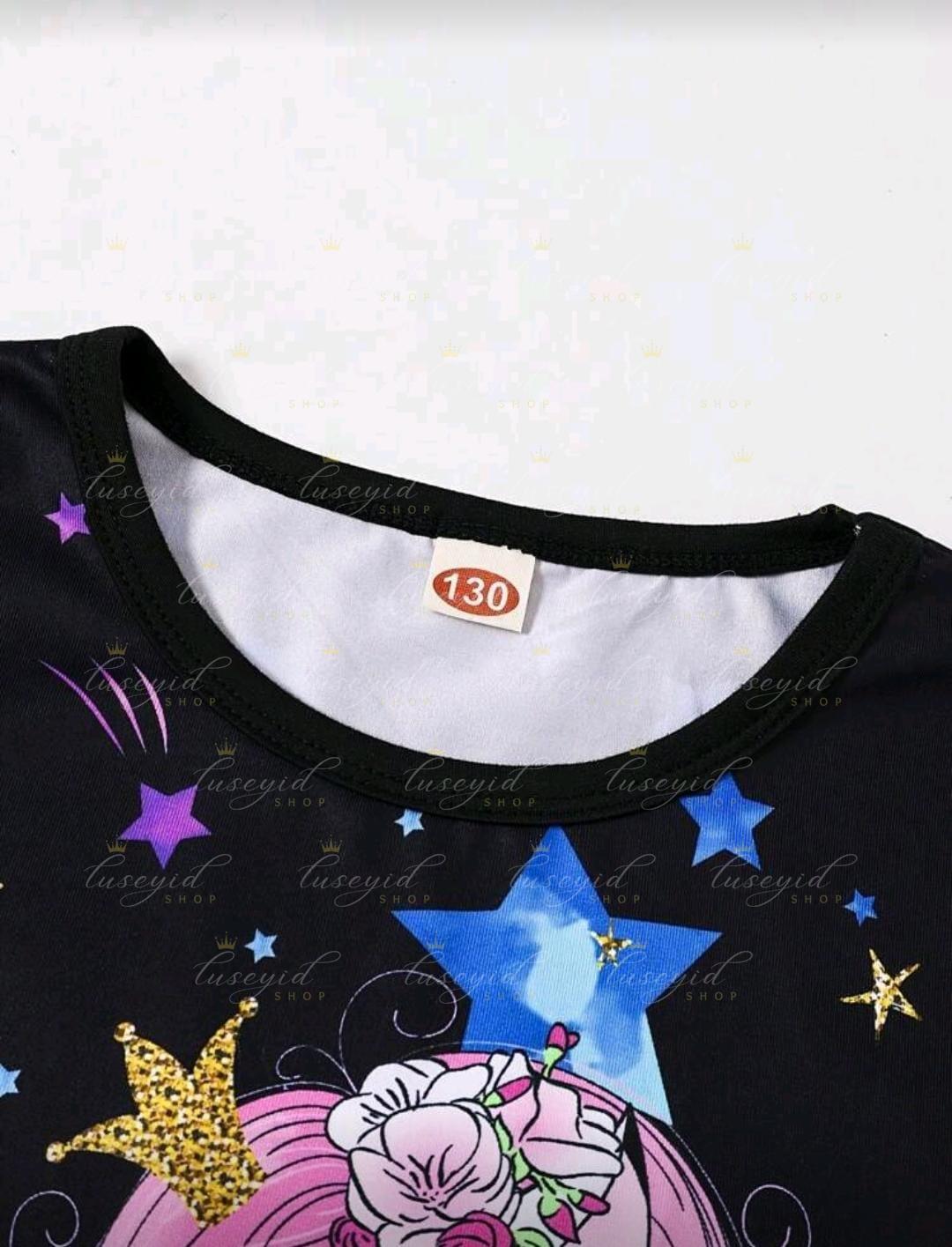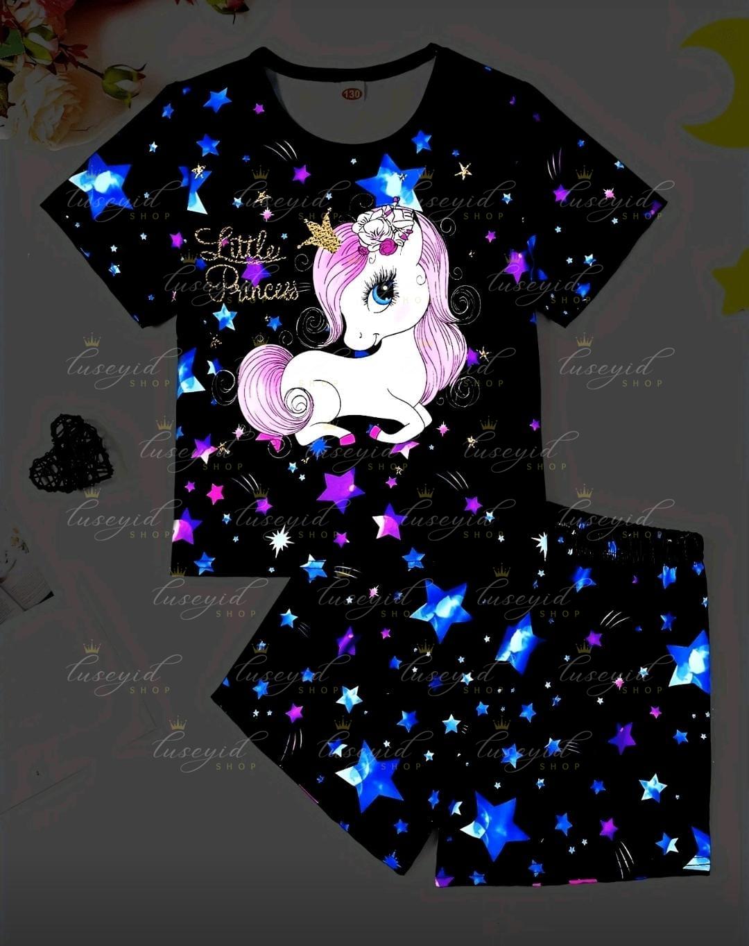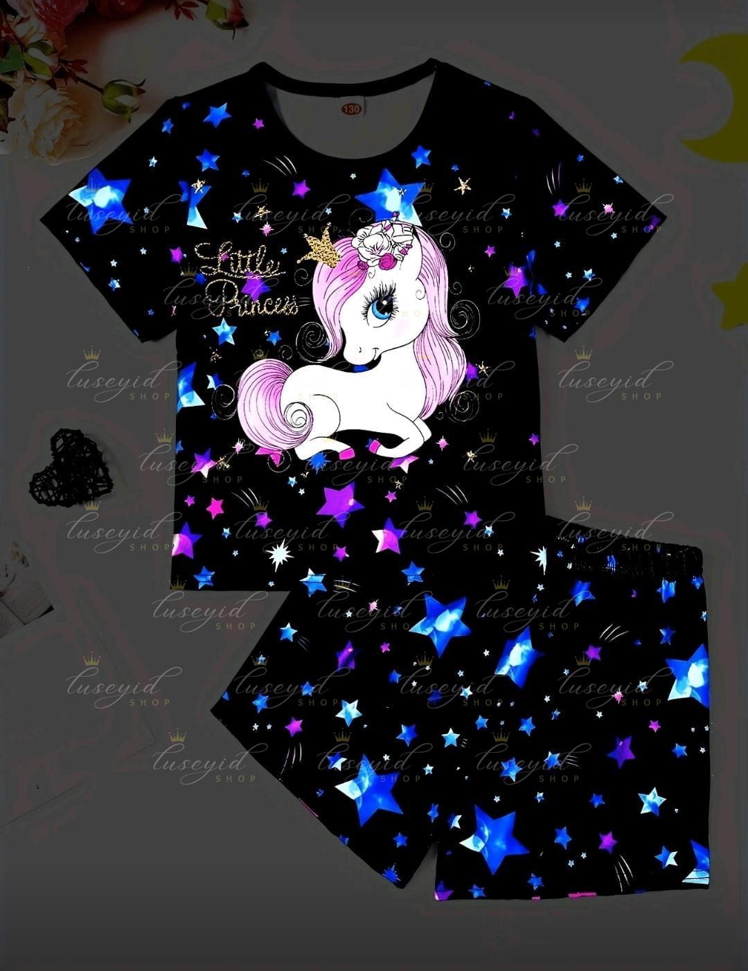 Conjunto casual de verano con Top de manga corta y shorts con estampado de unicornio y estrellas que brillan en la oscuridad para niñas preadolescentes