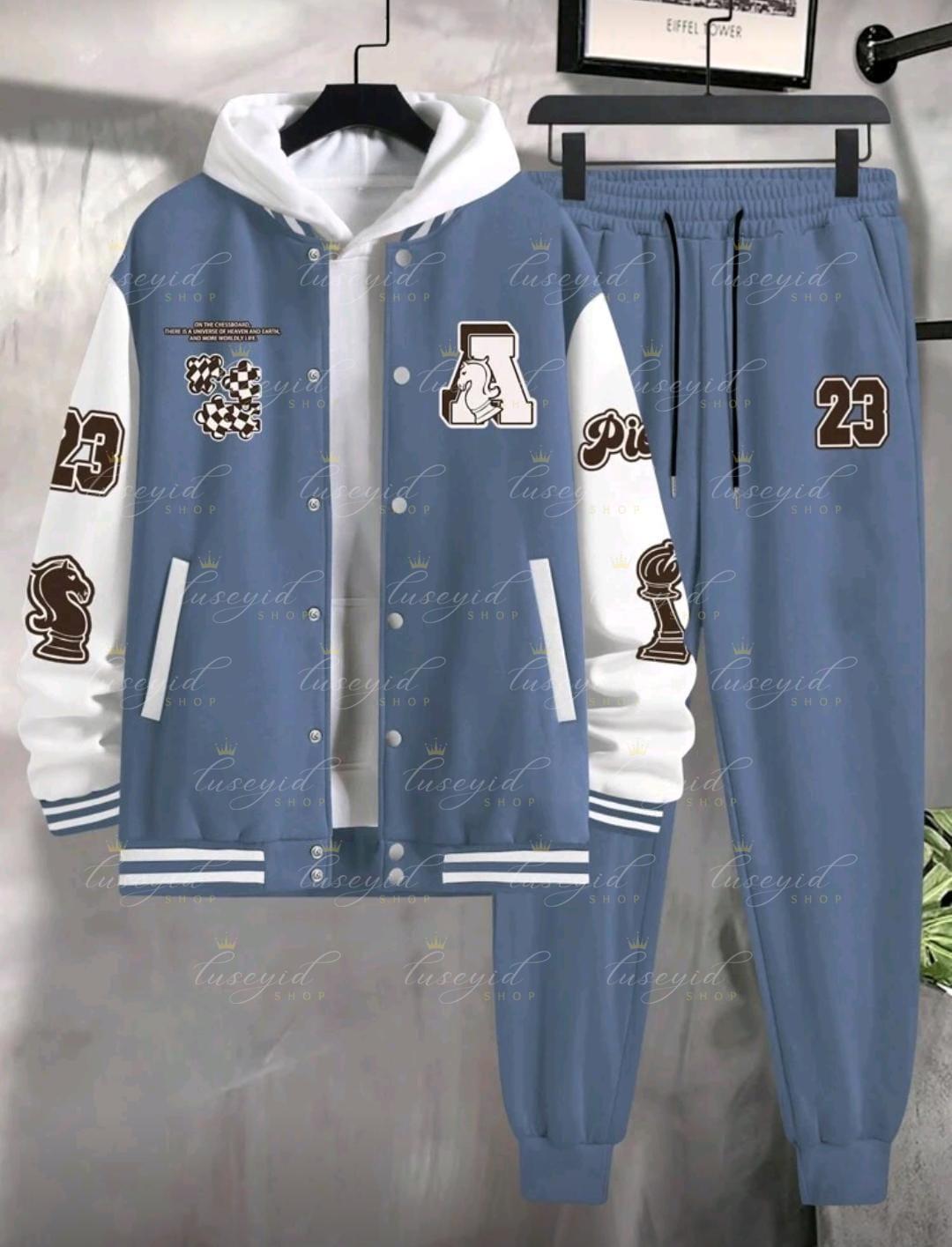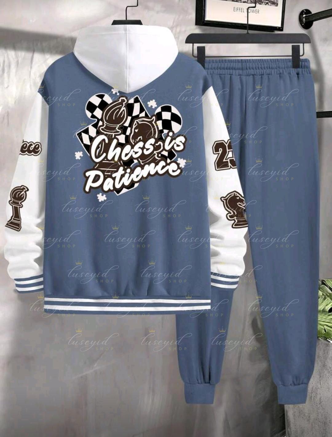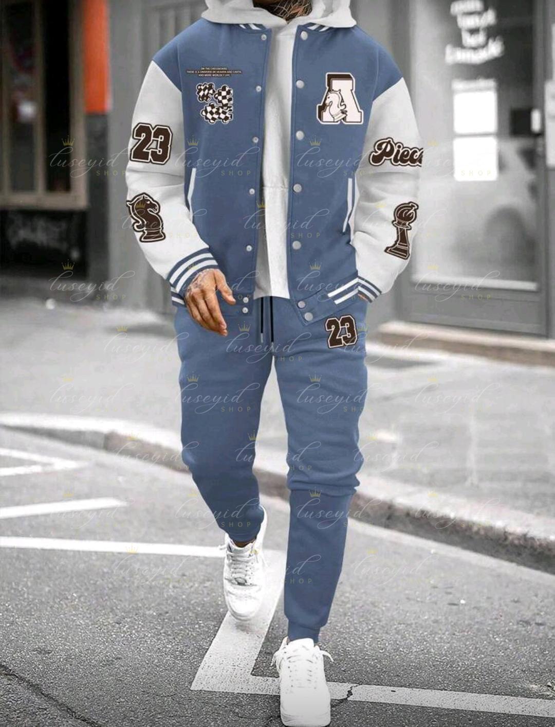Manfinity Homme Conjunto de dos piezas para hombre con chaqueta estampada con letras y bloques de color, y pantalones jogger. Conjunto de 2 piezas para hombre en azul, conjunto de 2 piezas para hombre, pantalón jogger para hombre, conjunto de chándal para hombre, conjunto de 2 piezas para hombre, ropa de otoño