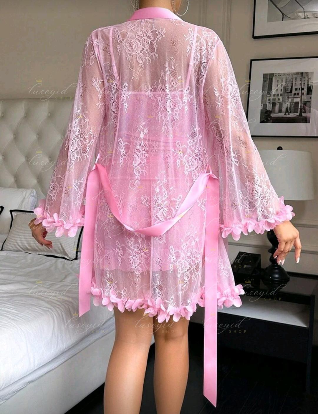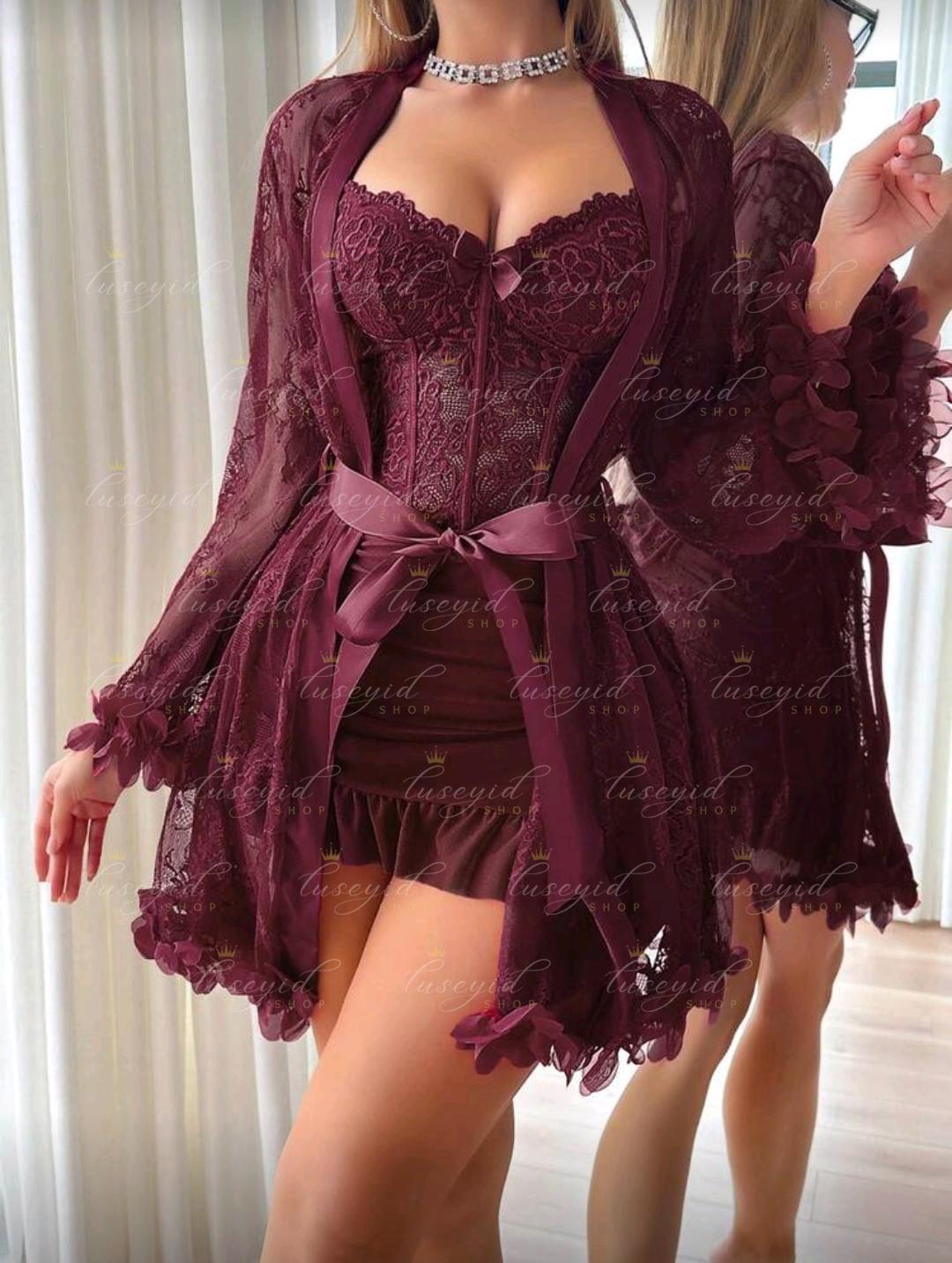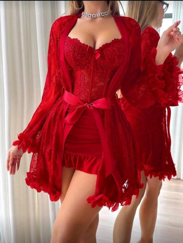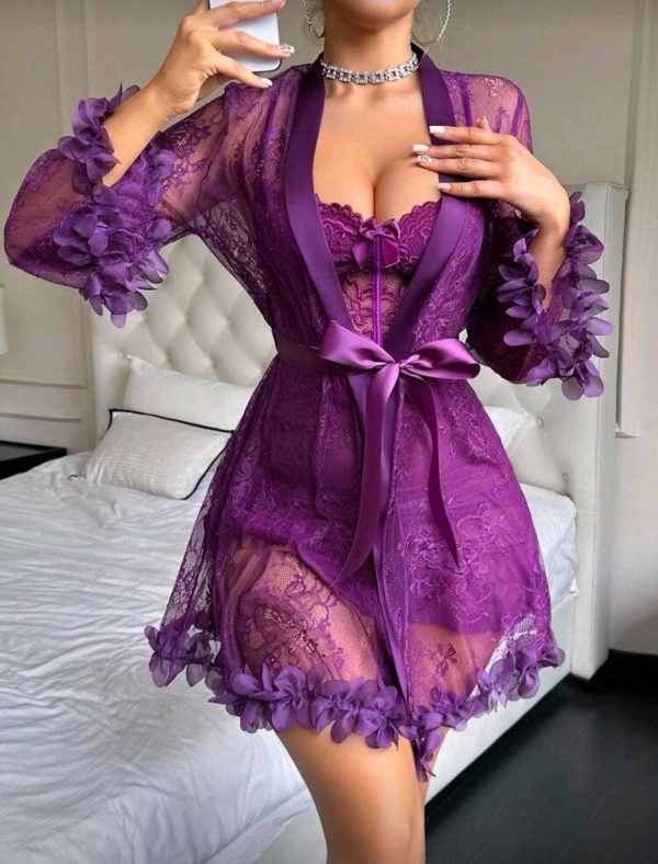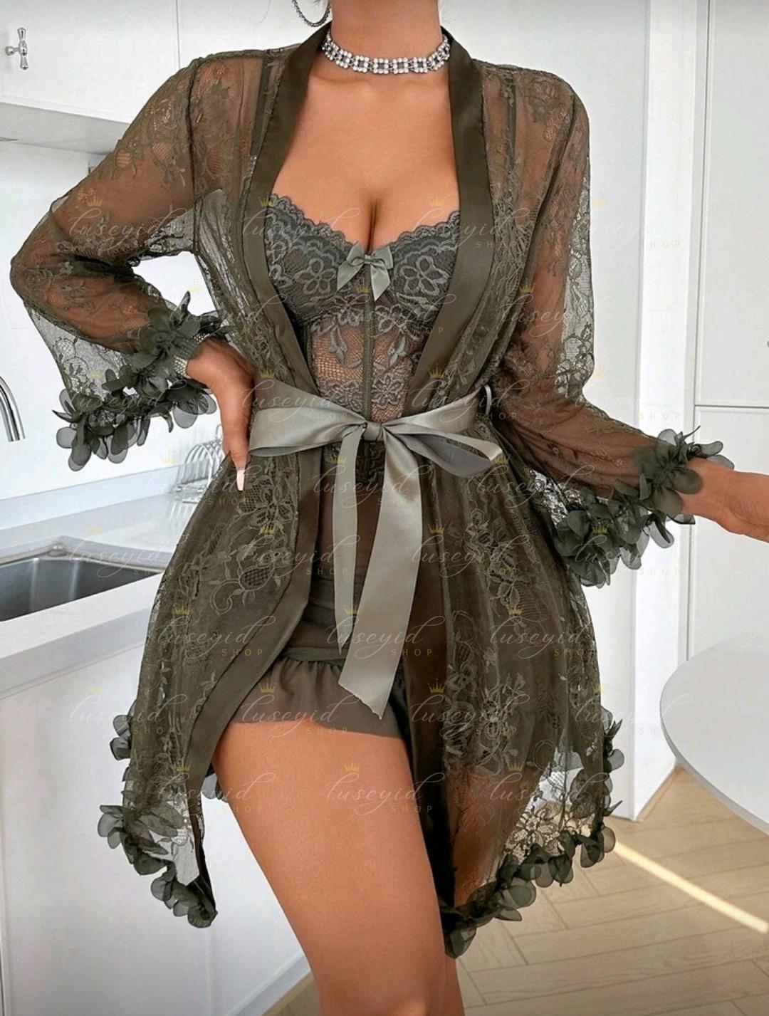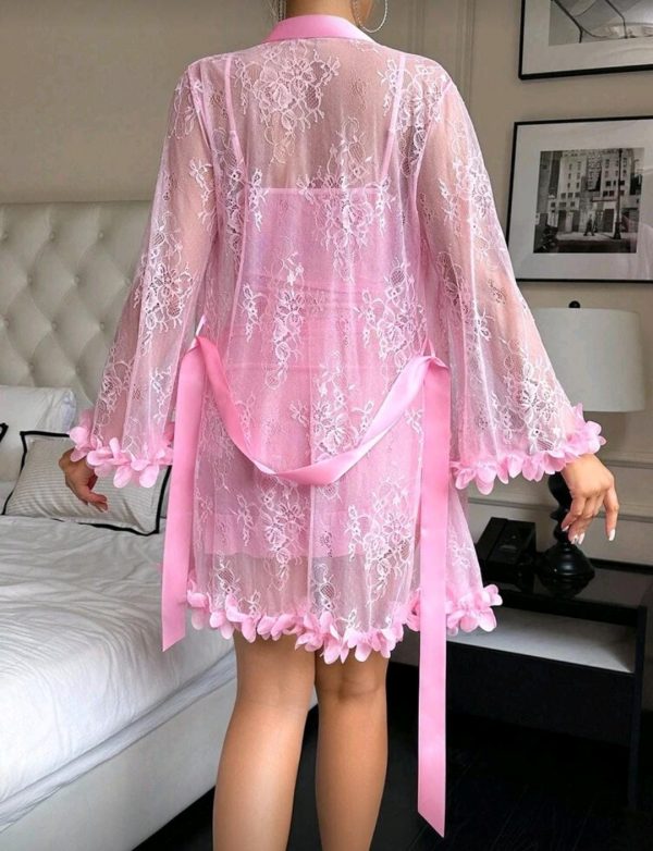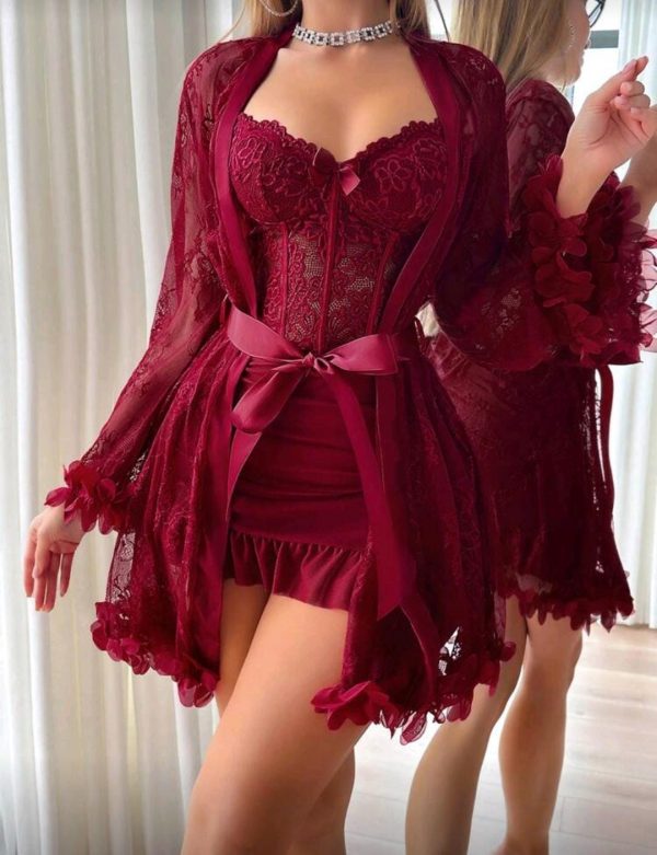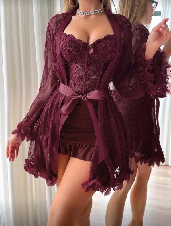 Set de 2 piezas: Bata de encaje floral 3D + Camisón de encaje con diseño de espina de pescado en la cintura