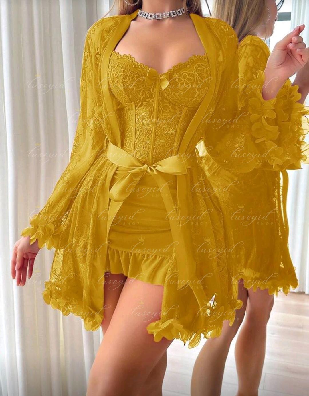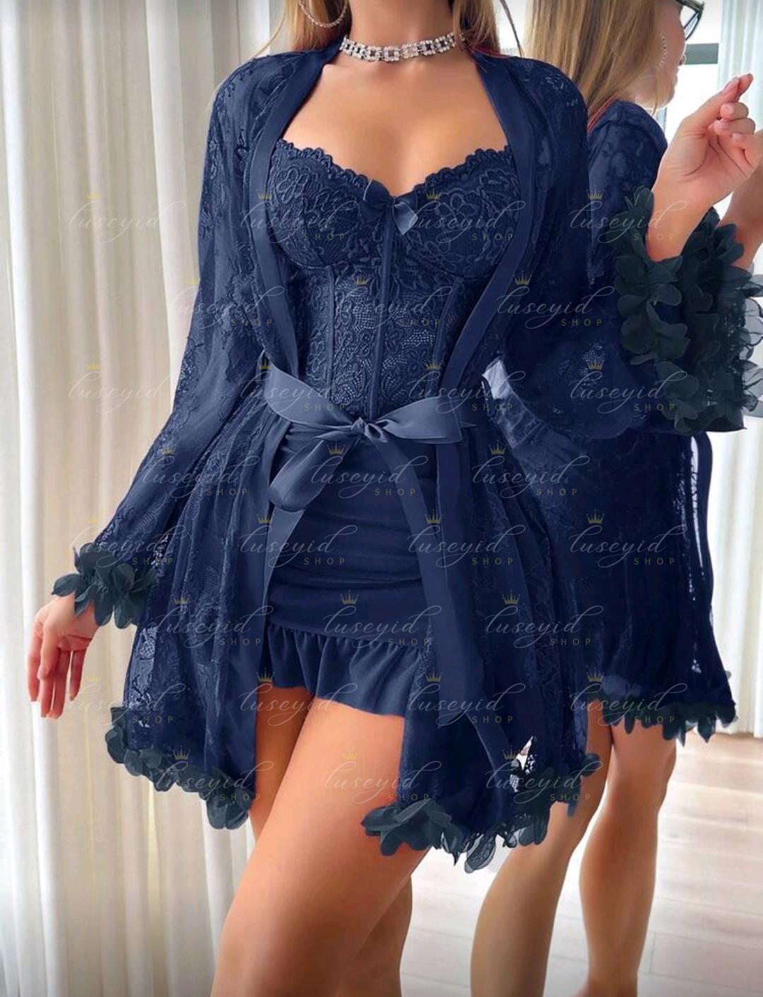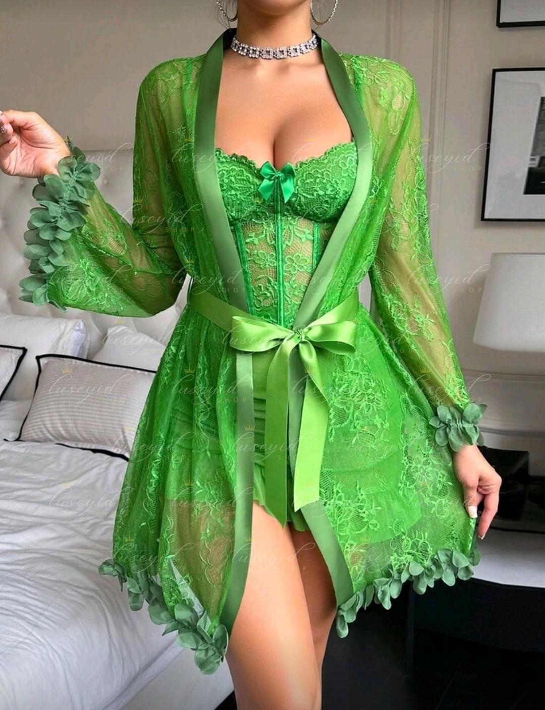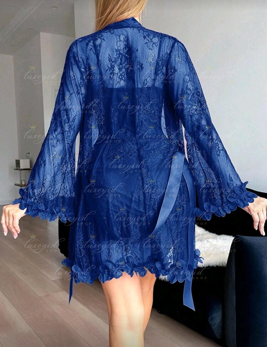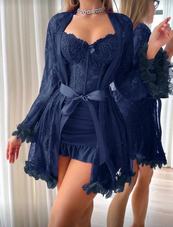 Set de 2 piezas: Bata de encaje floral 3D + Camisón de encaje con diseño de espina de pescado en la cintura