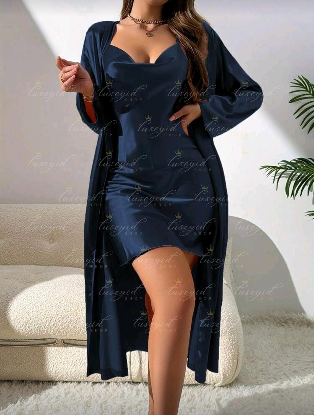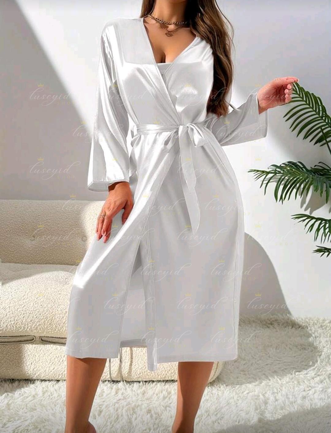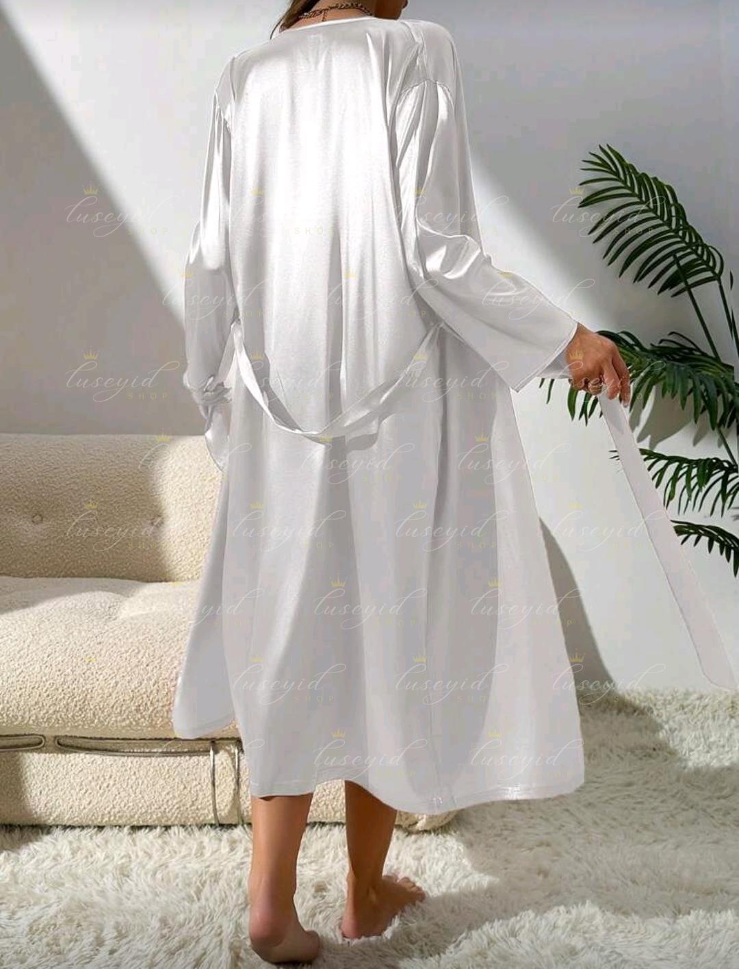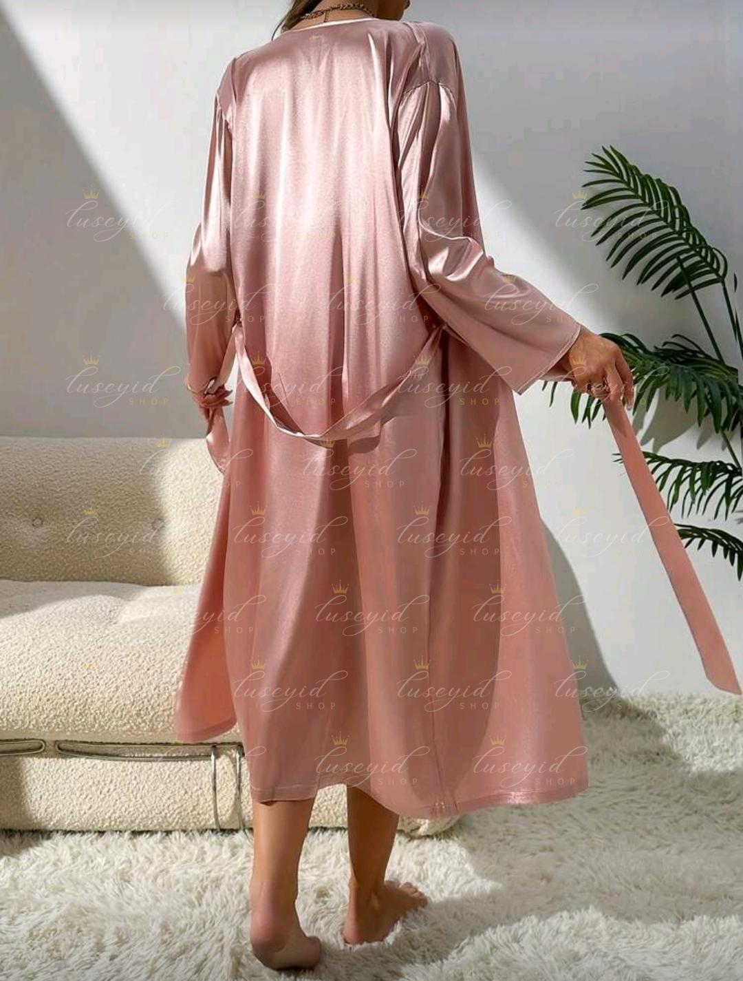 2 piezas Conjunto de ropa de dormir para mujer – Bata larga y camisón de unicolor, tela tipo seda cómoda, estilo de vestido elegante, adecuado para usar en casa y dormir, para todas las estaciones, ropa de otoño