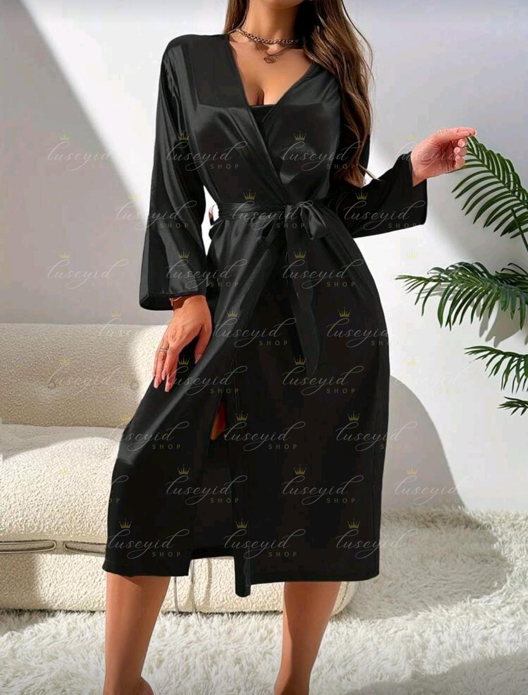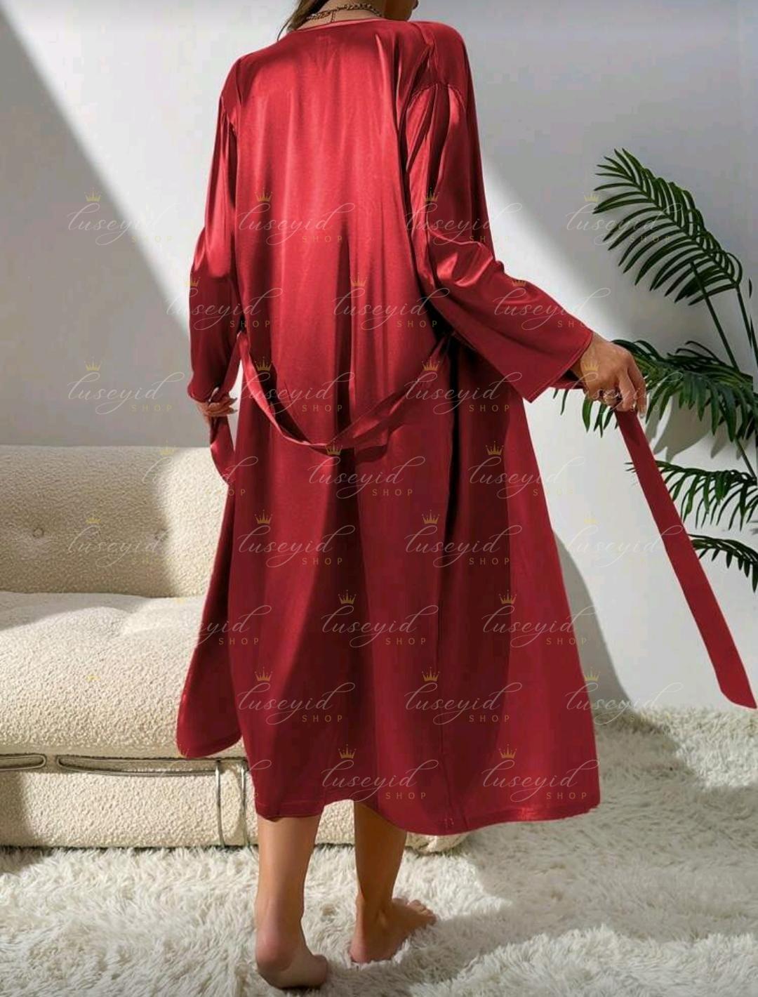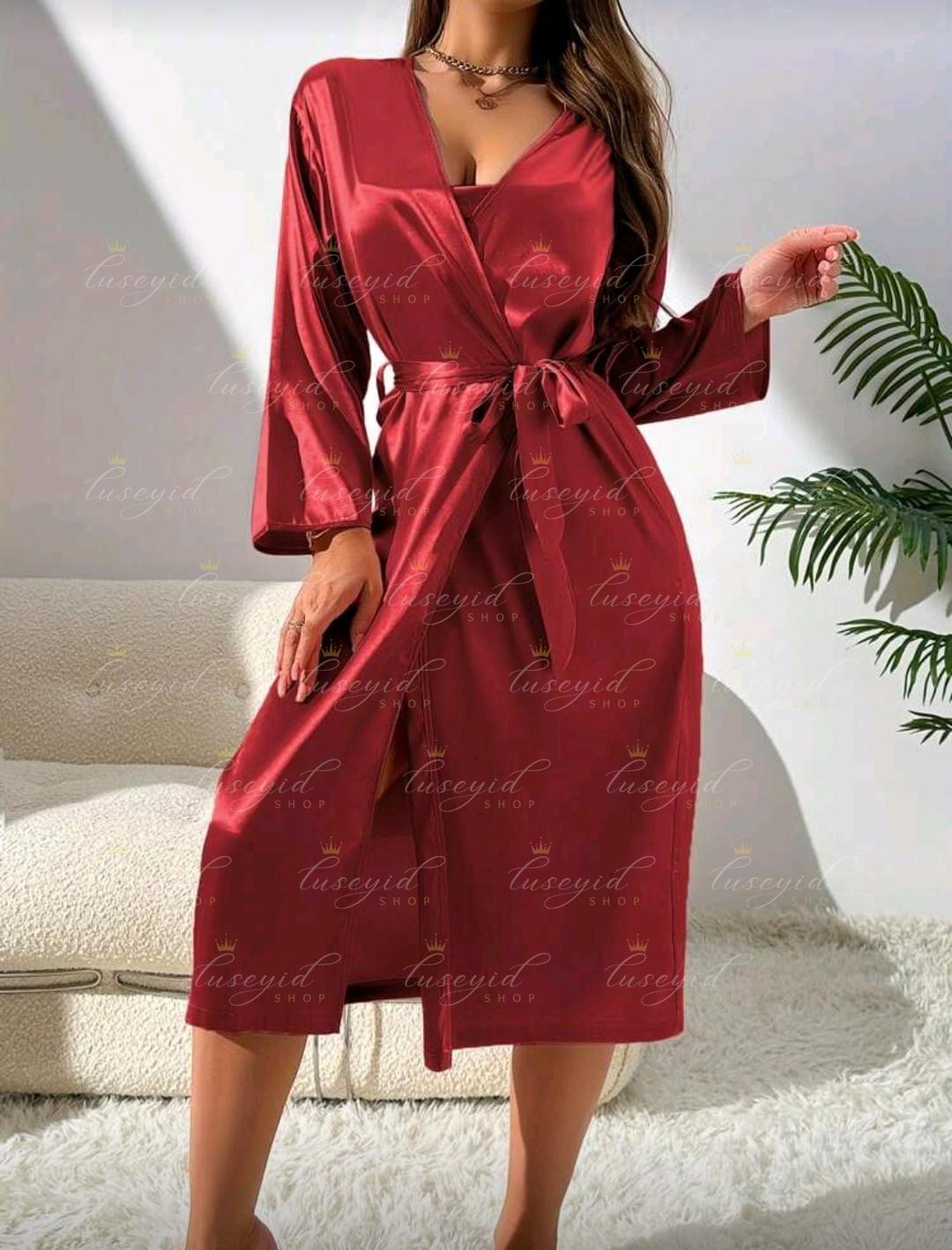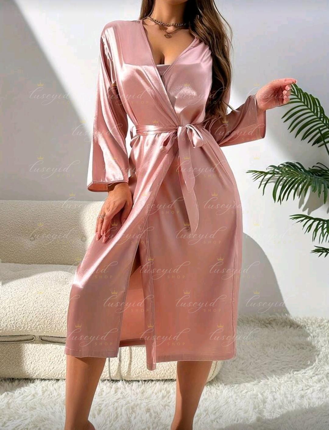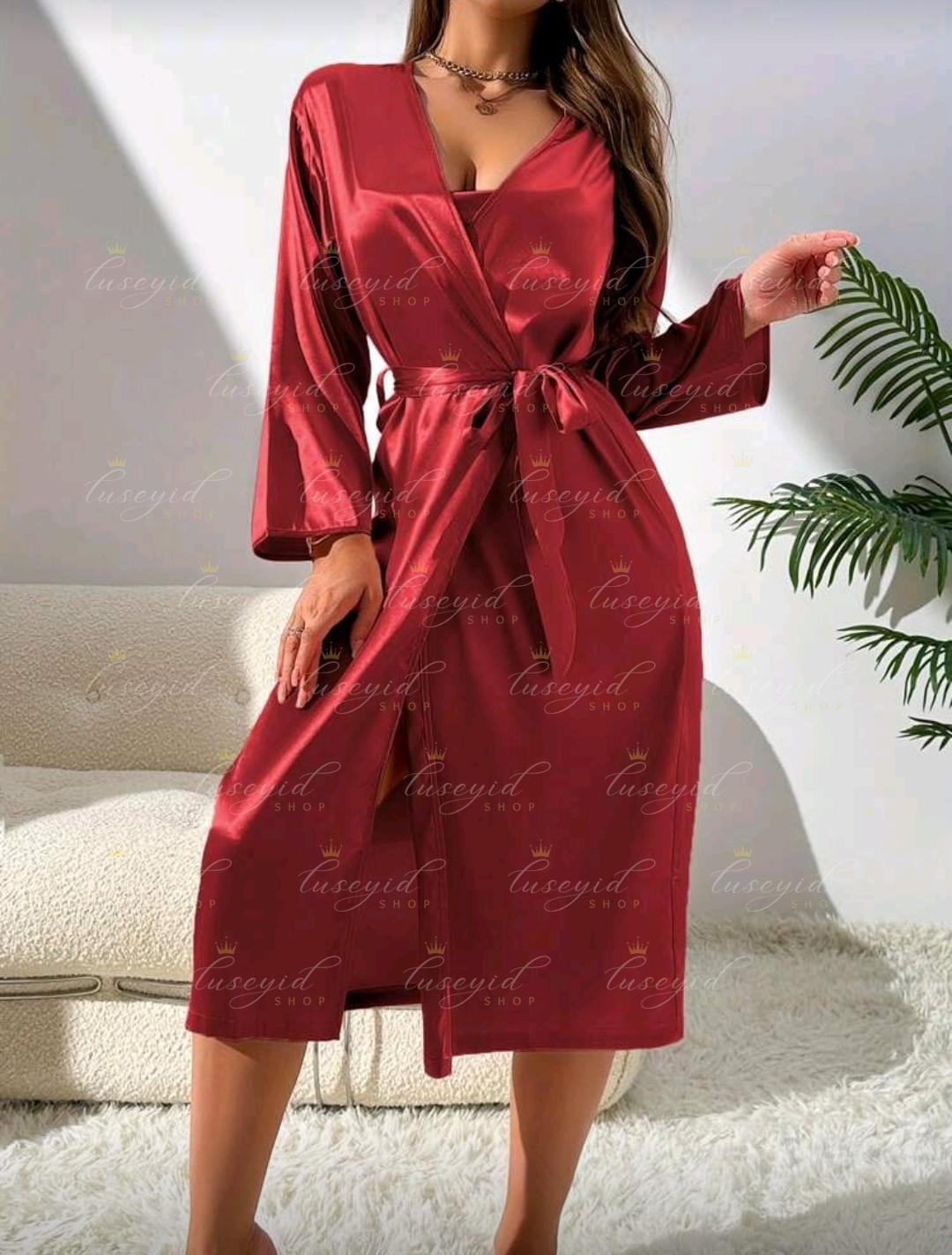 2 piezas Conjunto de ropa de dormir para mujer – Bata larga y camisón de unicolor, tela tipo seda cómoda, estilo de vestido elegante, adecuado para usar en casa y dormir, para todas las estaciones, ropa de otoño