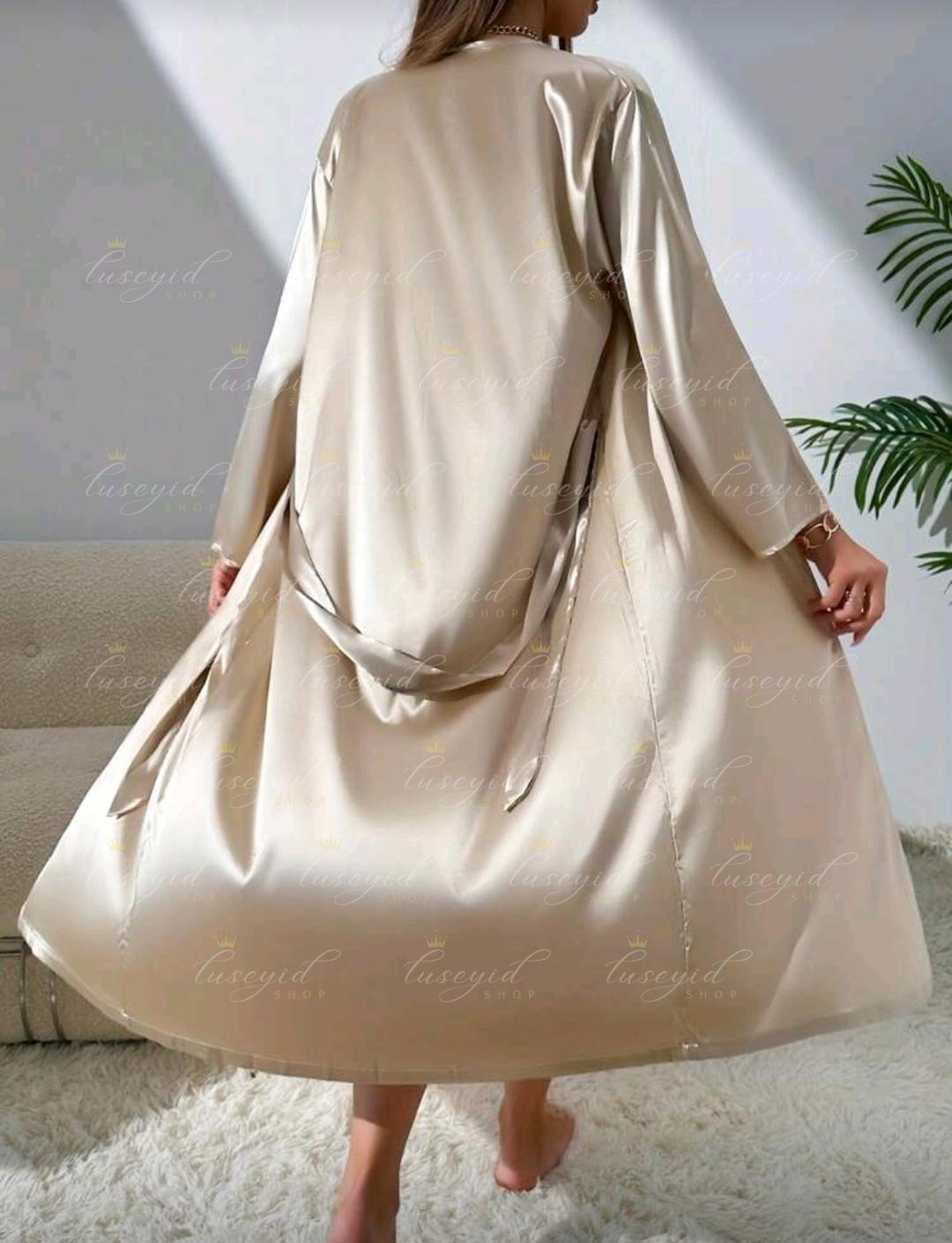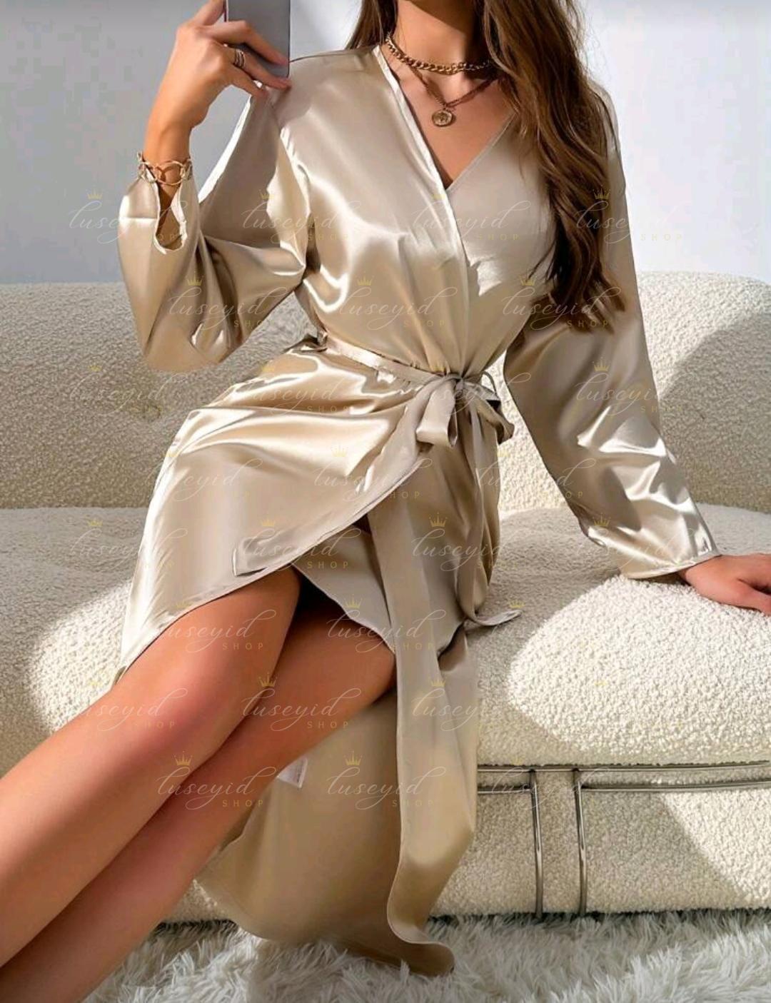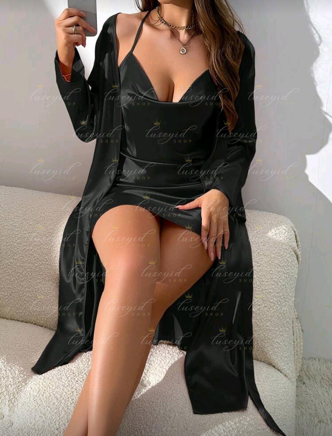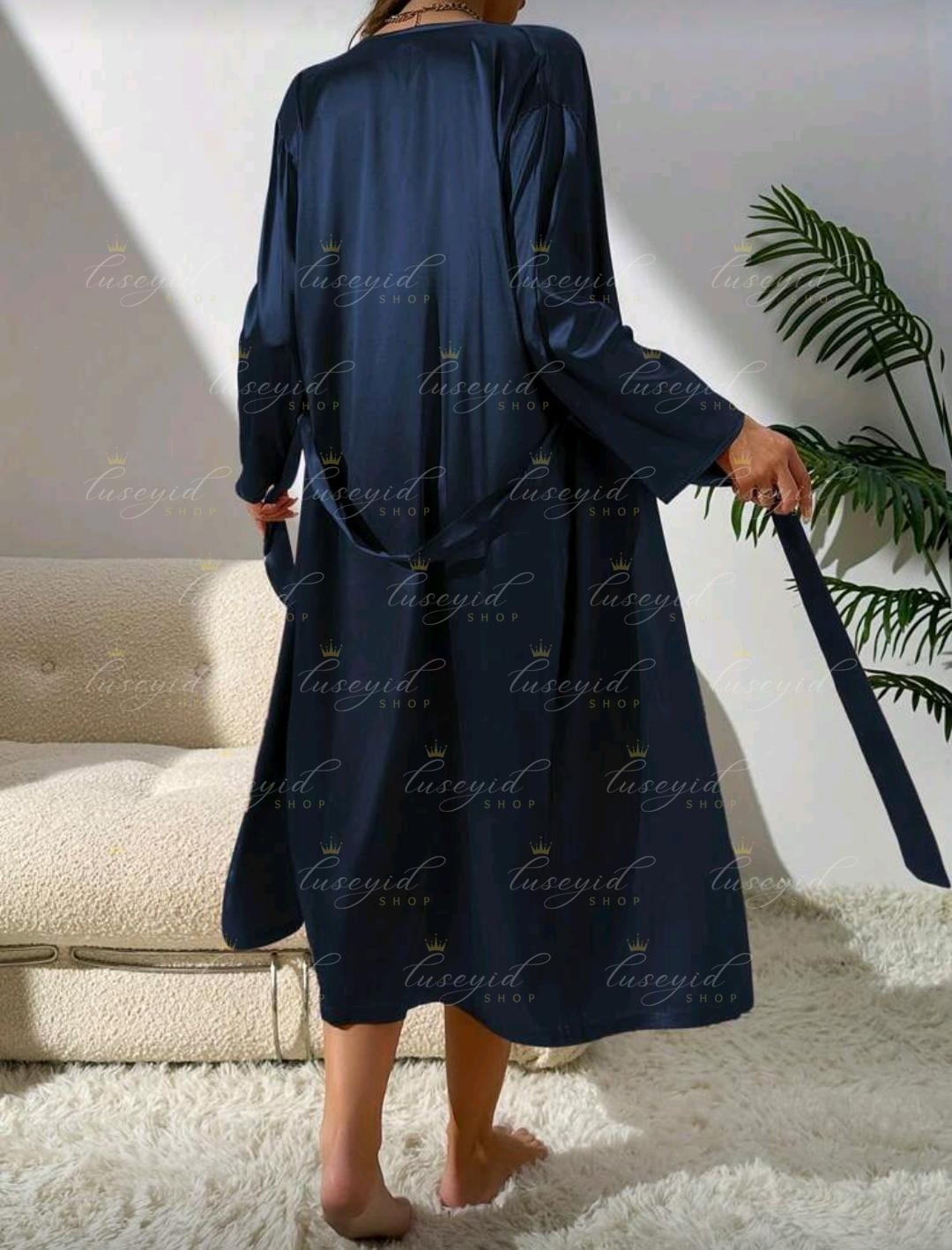 2 piezas Conjunto de ropa de dormir para mujer – Bata larga y camisón de unicolor, tela tipo seda cómoda, estilo de vestido elegante, adecuado para usar en casa y dormir, para todas las estaciones, ropa de otoño