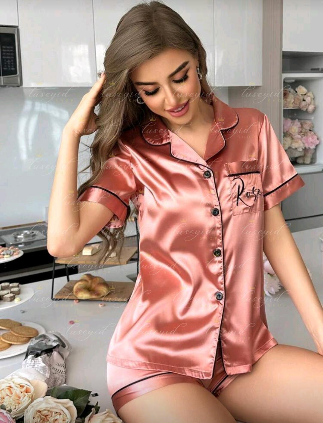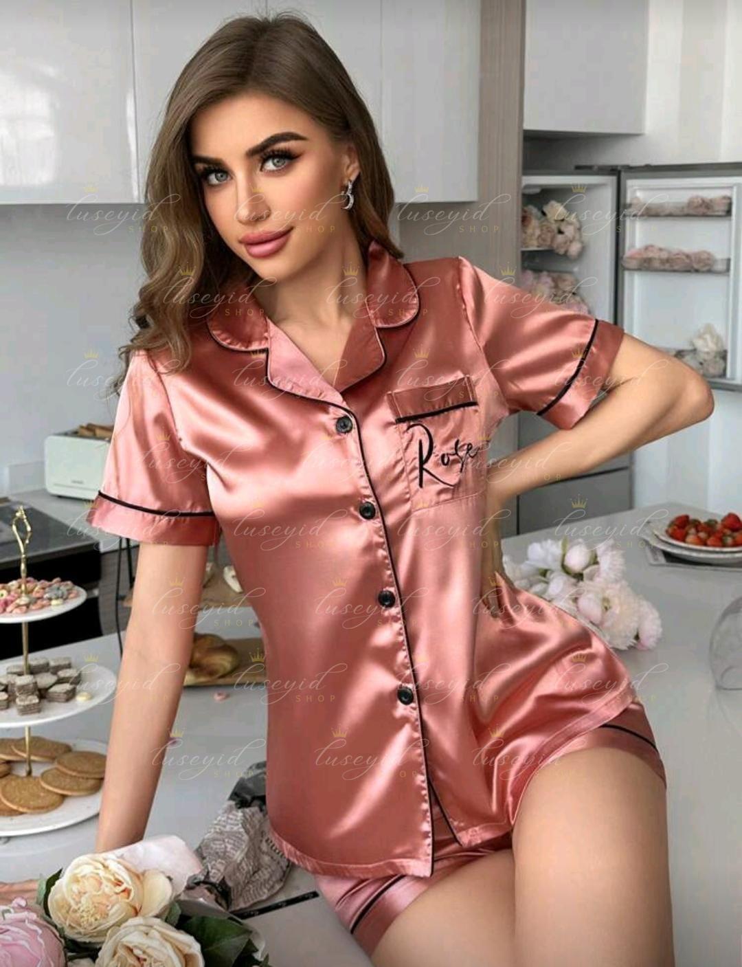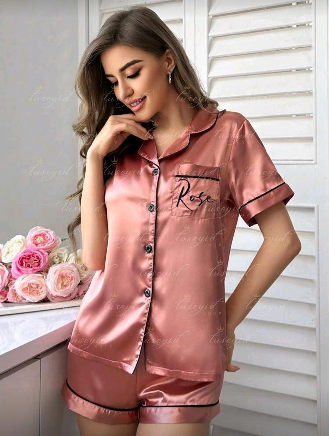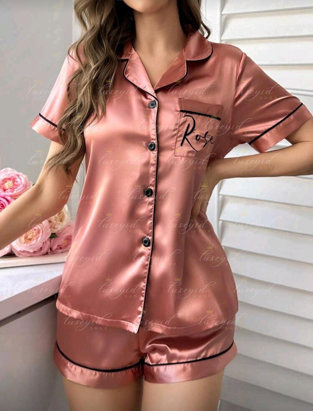 Conjunto de pijama de imitación de seda con top de cuello vuelto y pantalones cortos con bordado de bolsillo