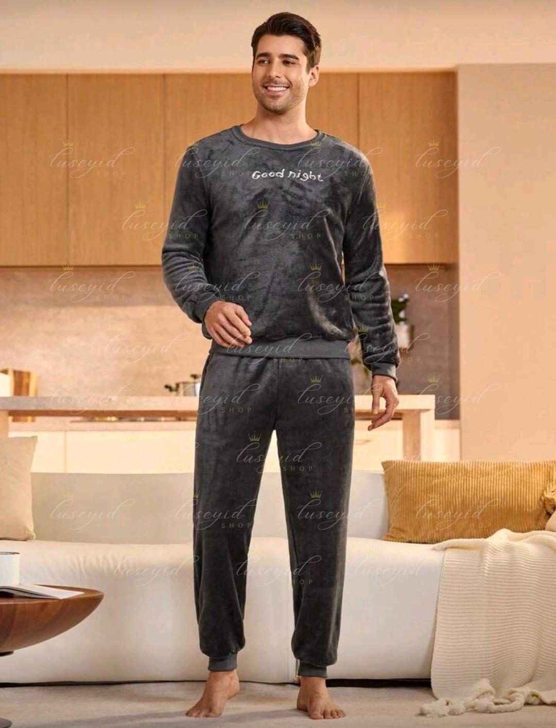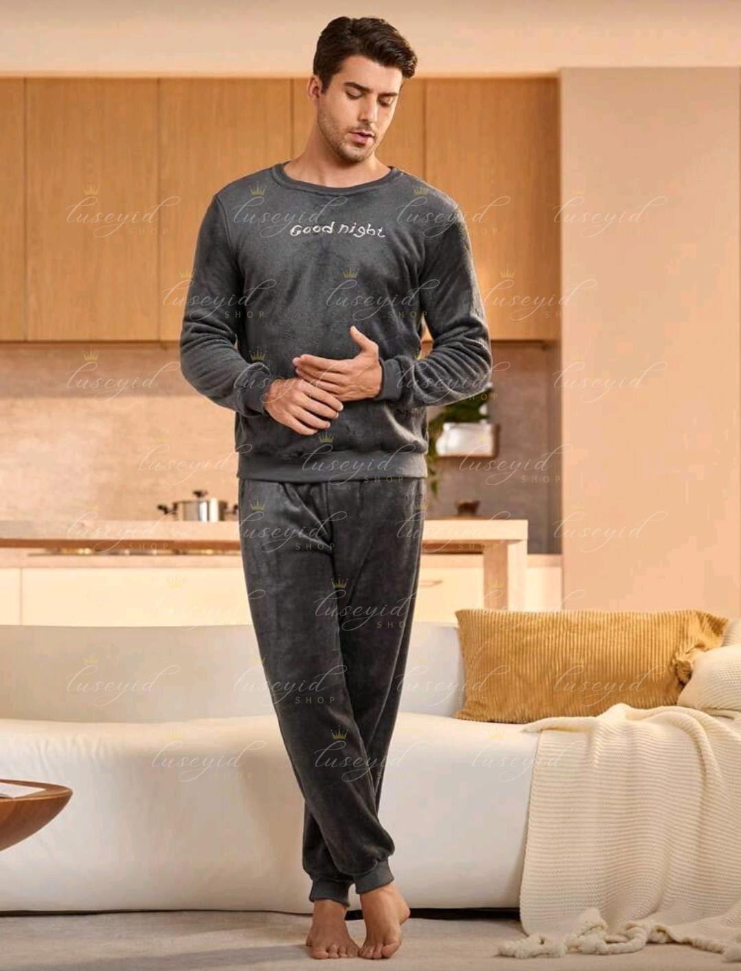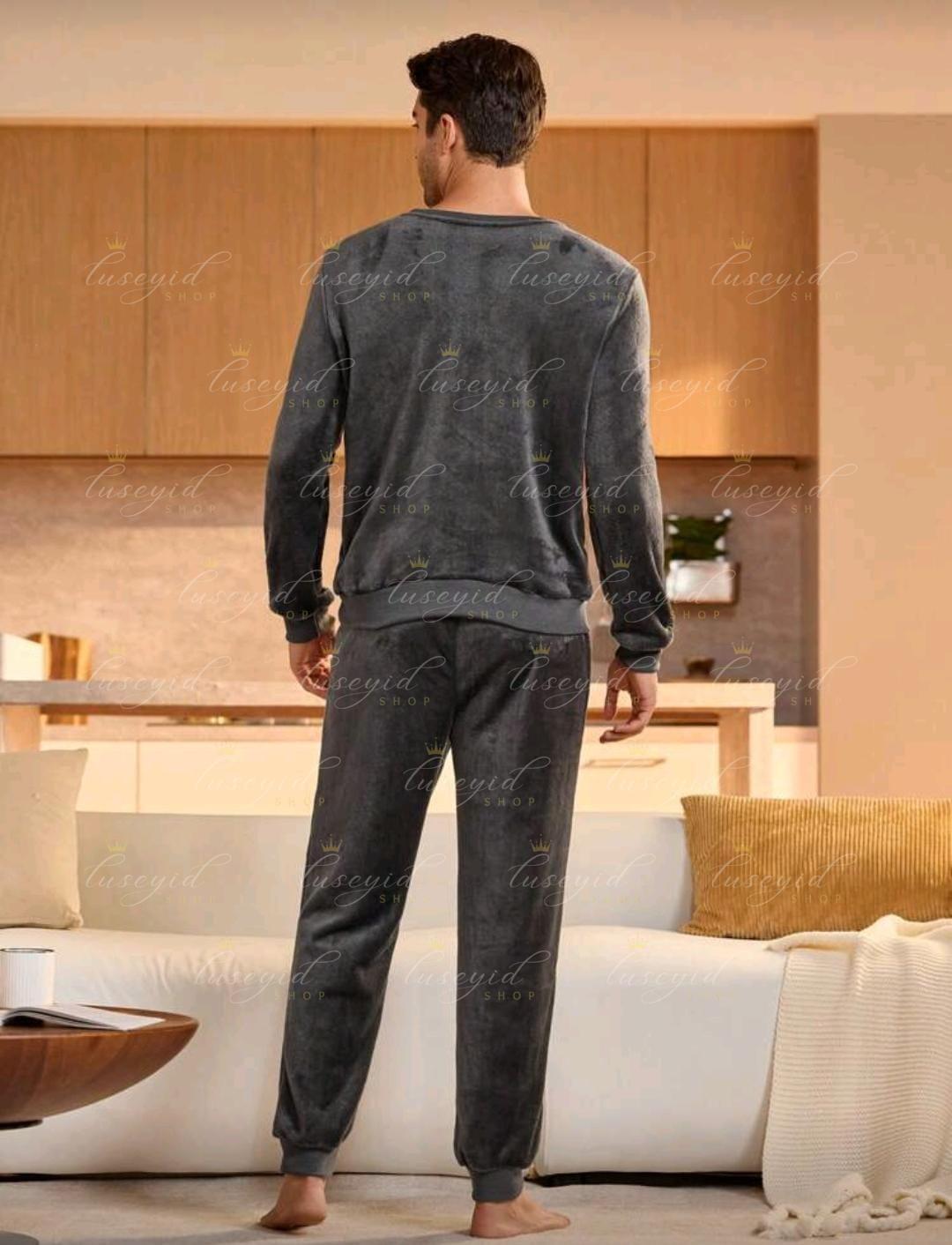 2 piezas Conjunto de pijama casual de hombre con cuello redondo, manga larga, bordado de letras, sencillo, cómodo y elegante, ropa de otoño e invierno, esponjoso