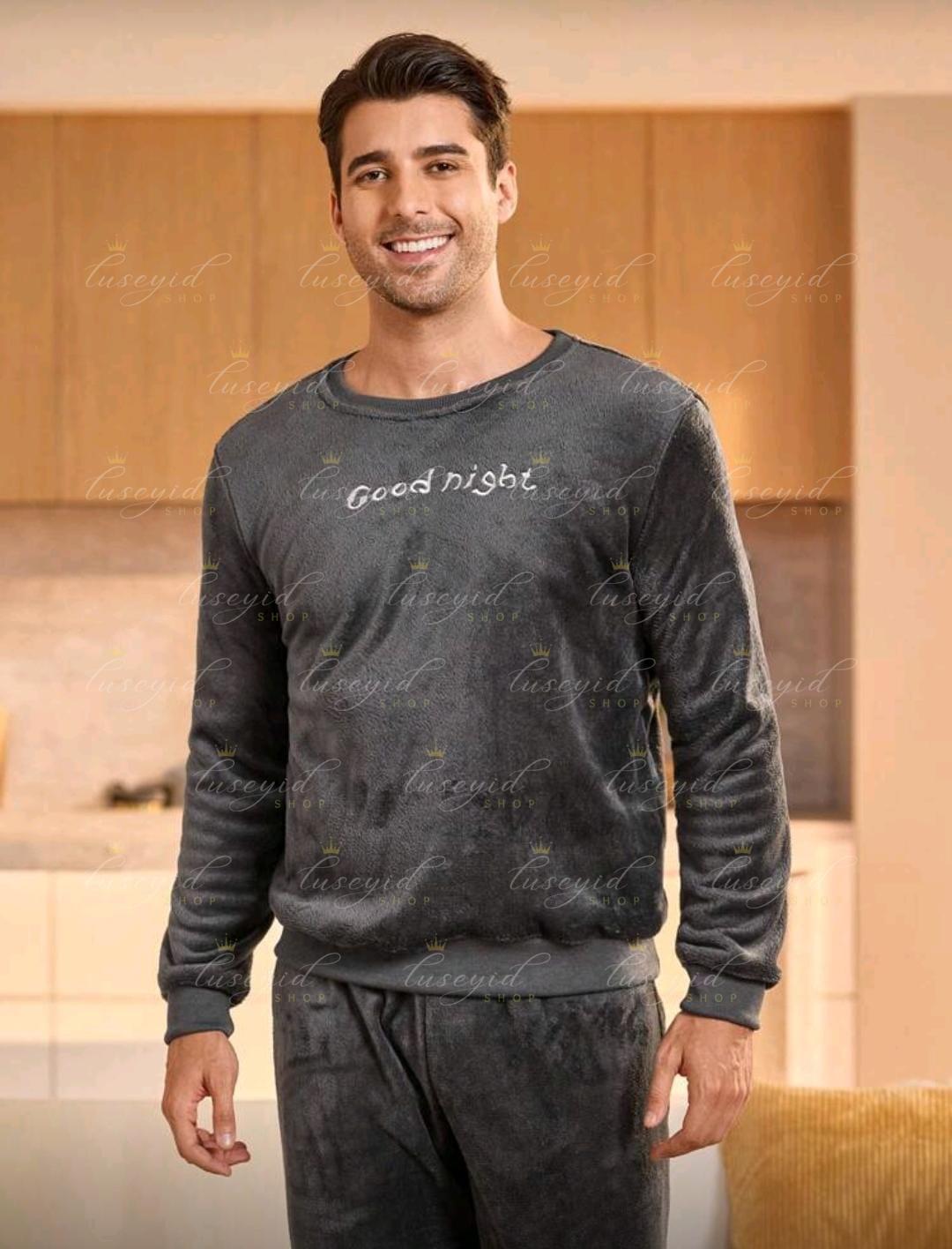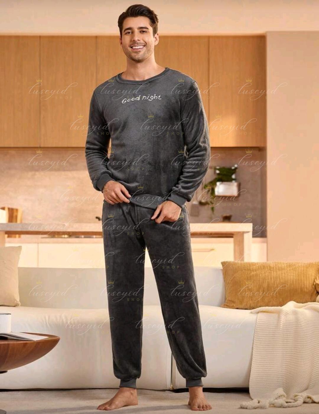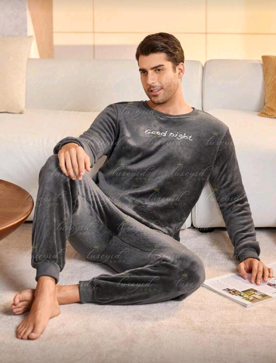 2 piezas Conjunto de pijama casual de hombre con cuello redondo, manga larga, bordado de letras, sencillo, cómodo y elegante, ropa de otoño e invierno, esponjoso