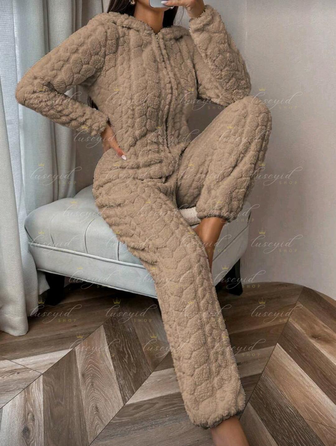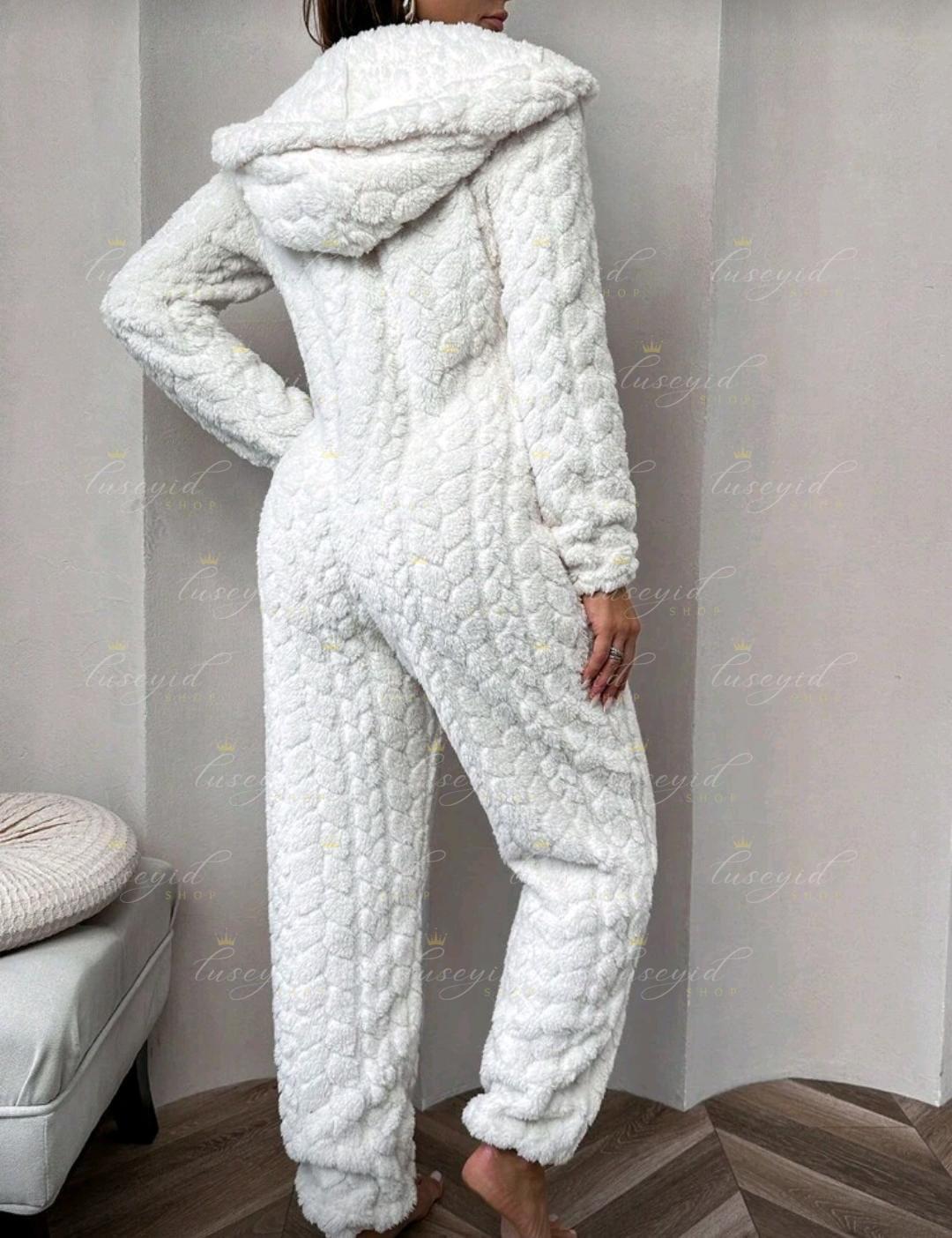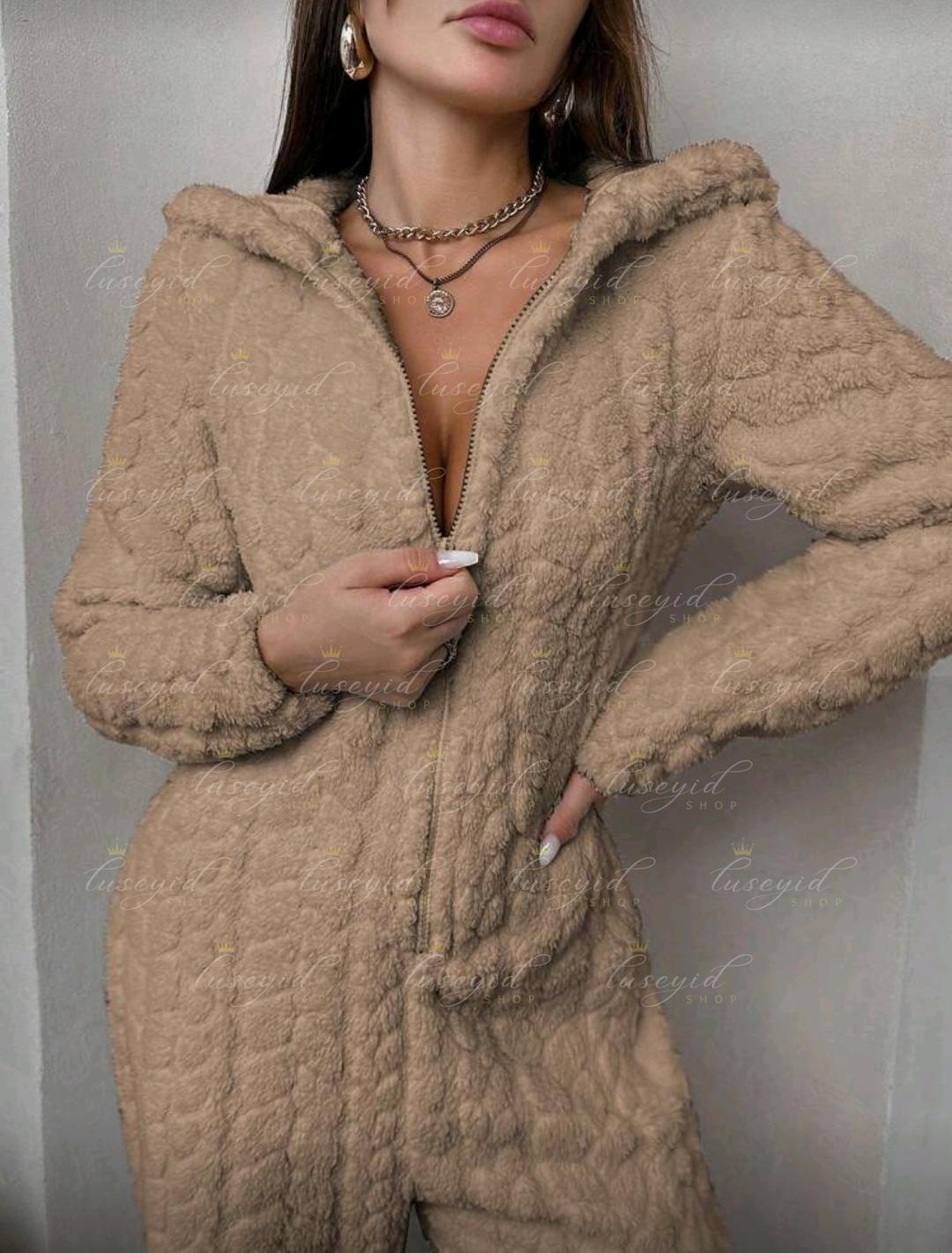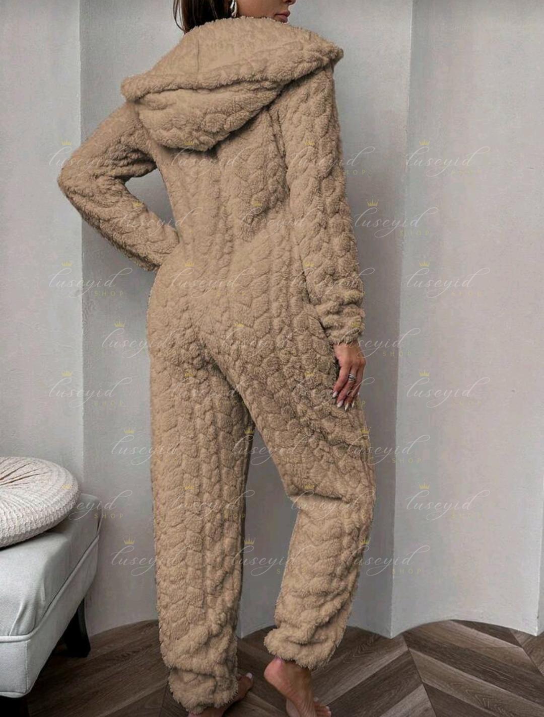 1 pieza Mono de una sola pieza con capucha con cremallera frontal, de unicolor y textura esponjosa, para otoño e invierno, atuendo acogedor