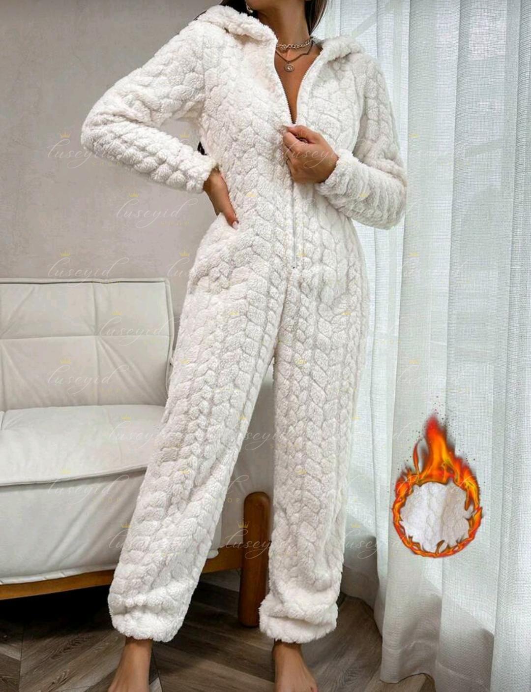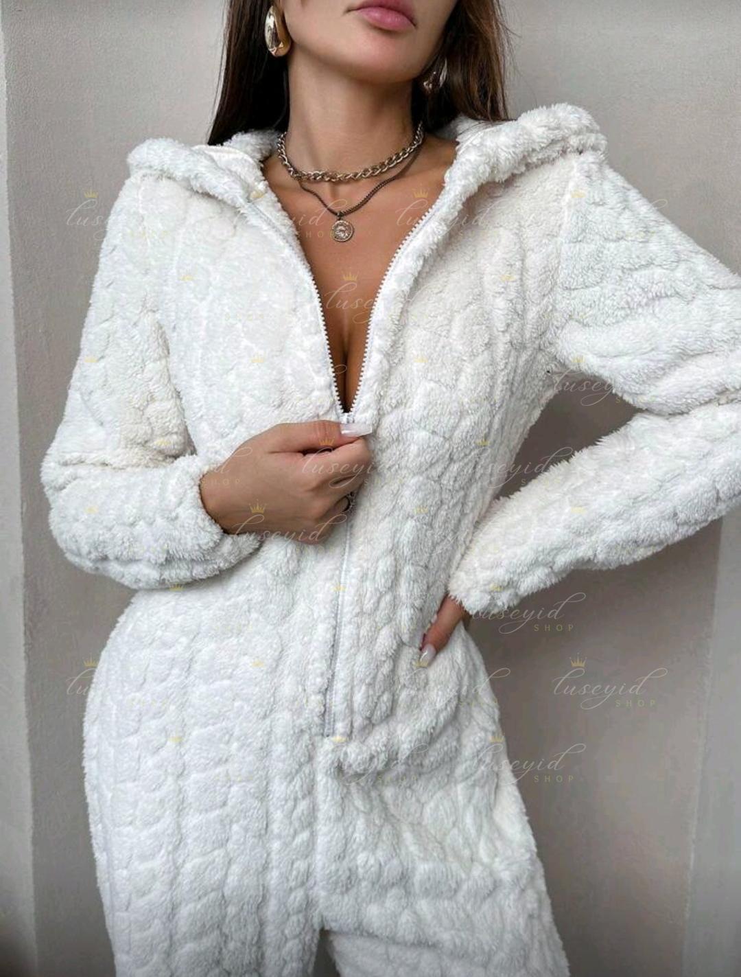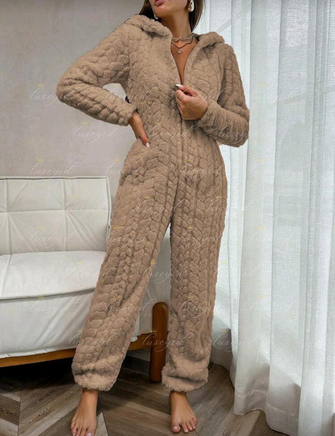 1 pieza Mono de una sola pieza con capucha con cremallera frontal, de unicolor y textura esponjosa, para otoño e invierno, atuendo acogedor