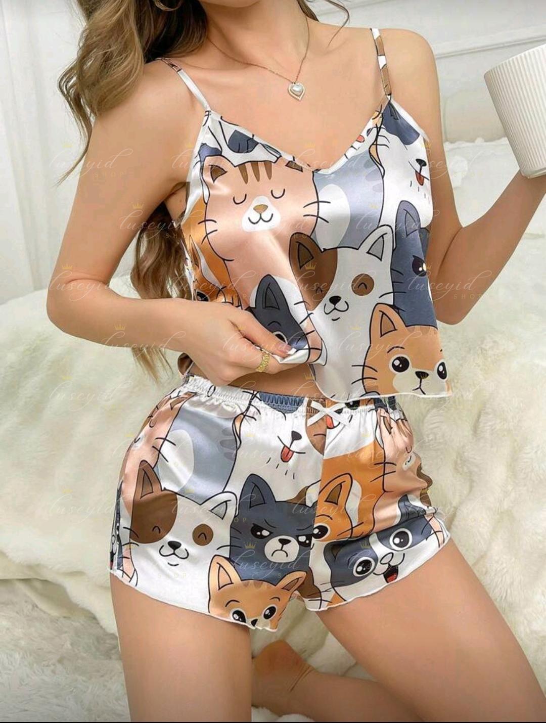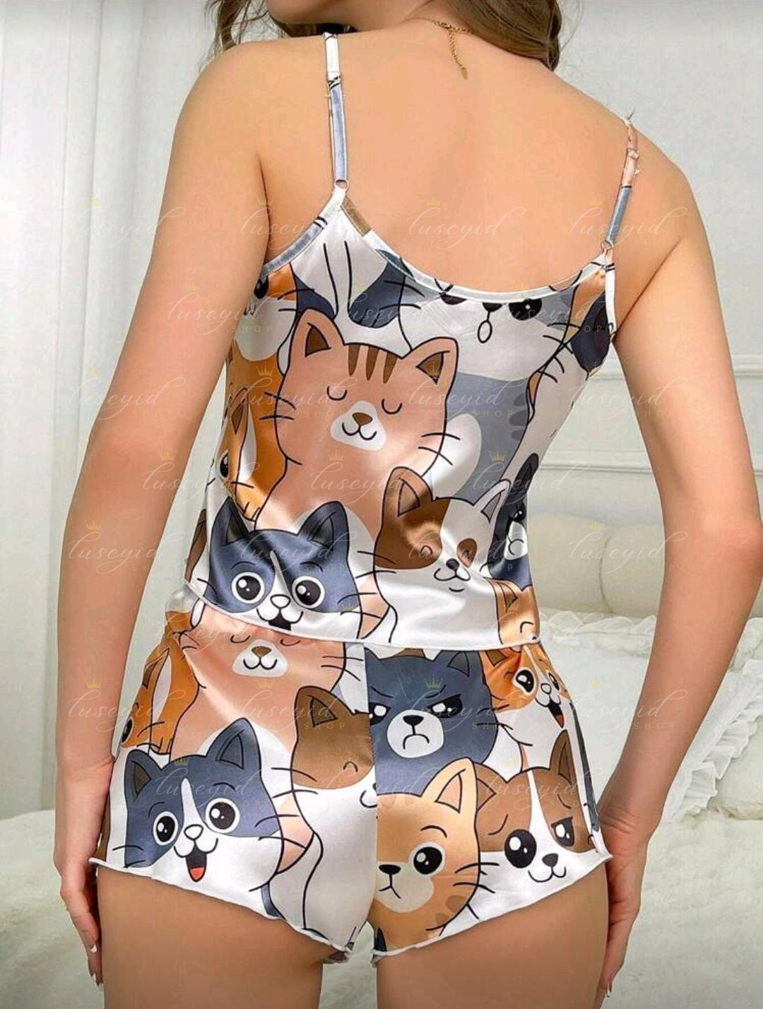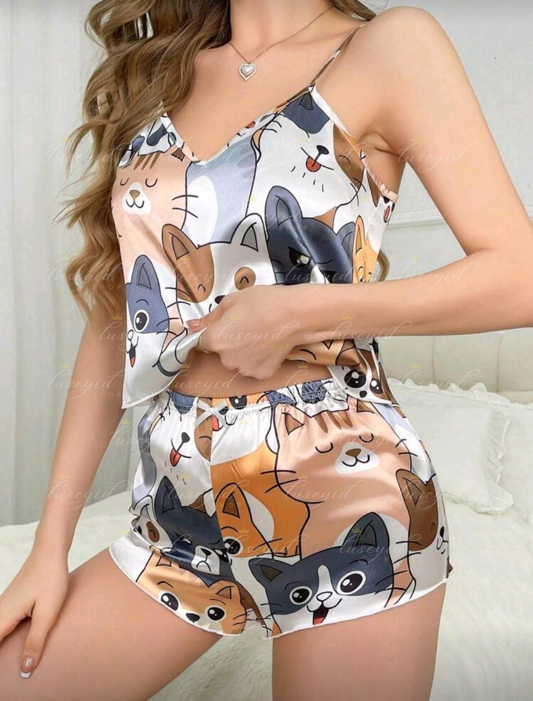 Conjunto De Pijama De Satén Con Estampado De Gato Para Dama.