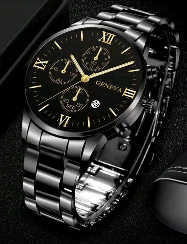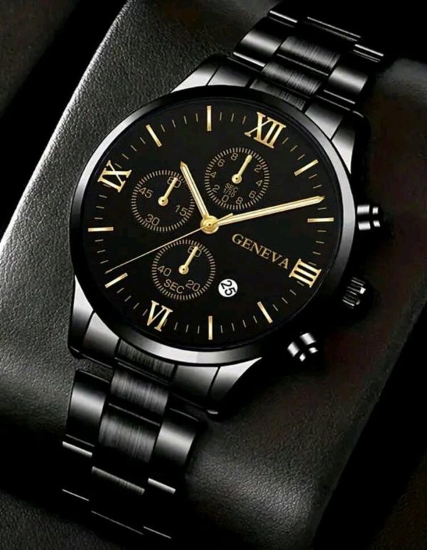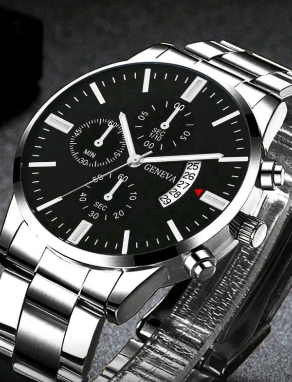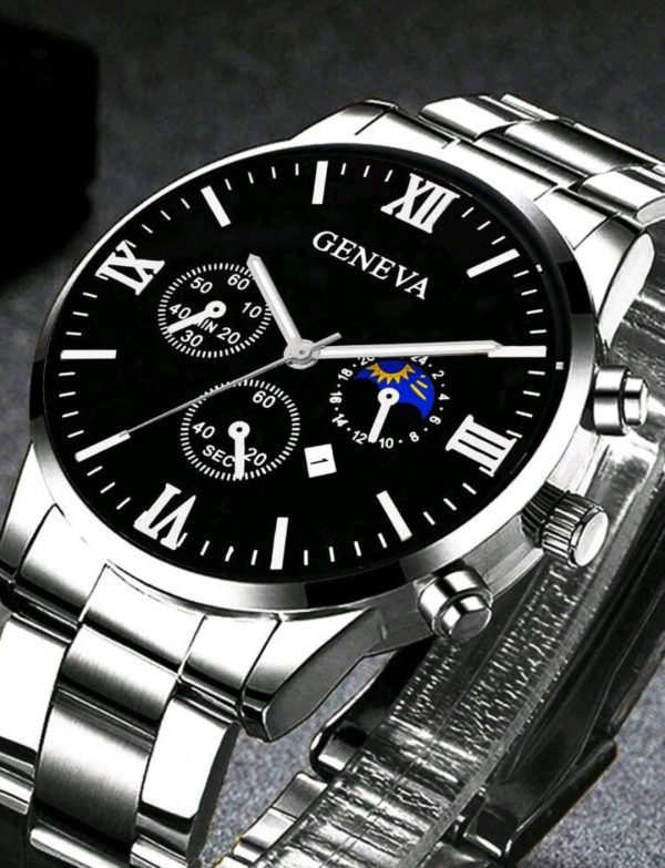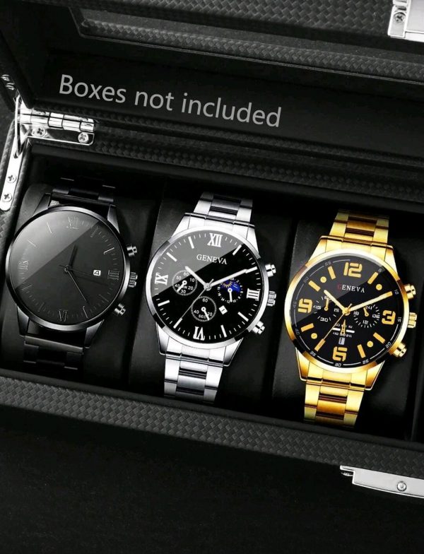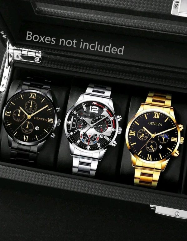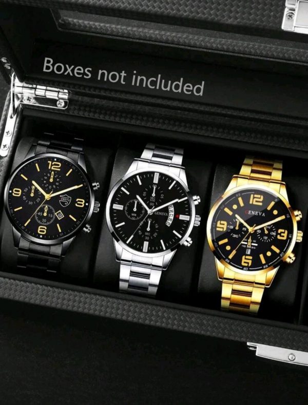 Set de 3 relojes de cuarzo casuales y de lujo para hombres – Esfera redonda de moda, función de fecha, caja de aleación y correa de acero inoxidable – Regalo perfecto para hombres