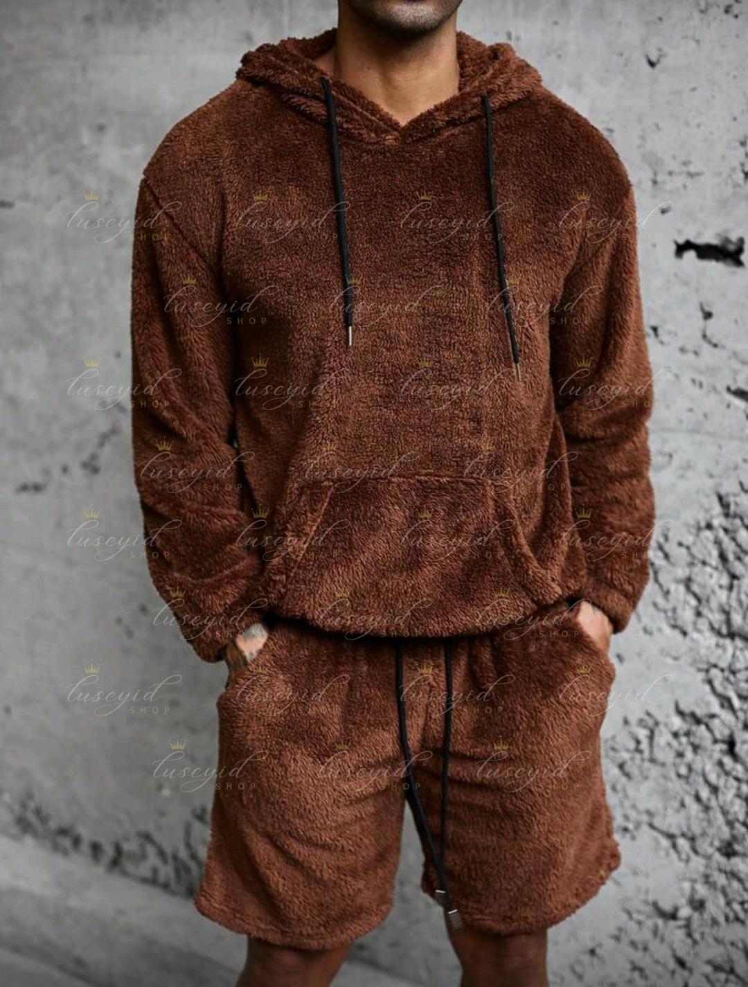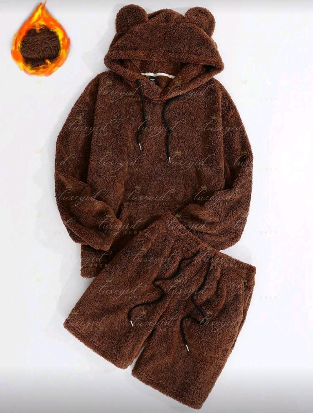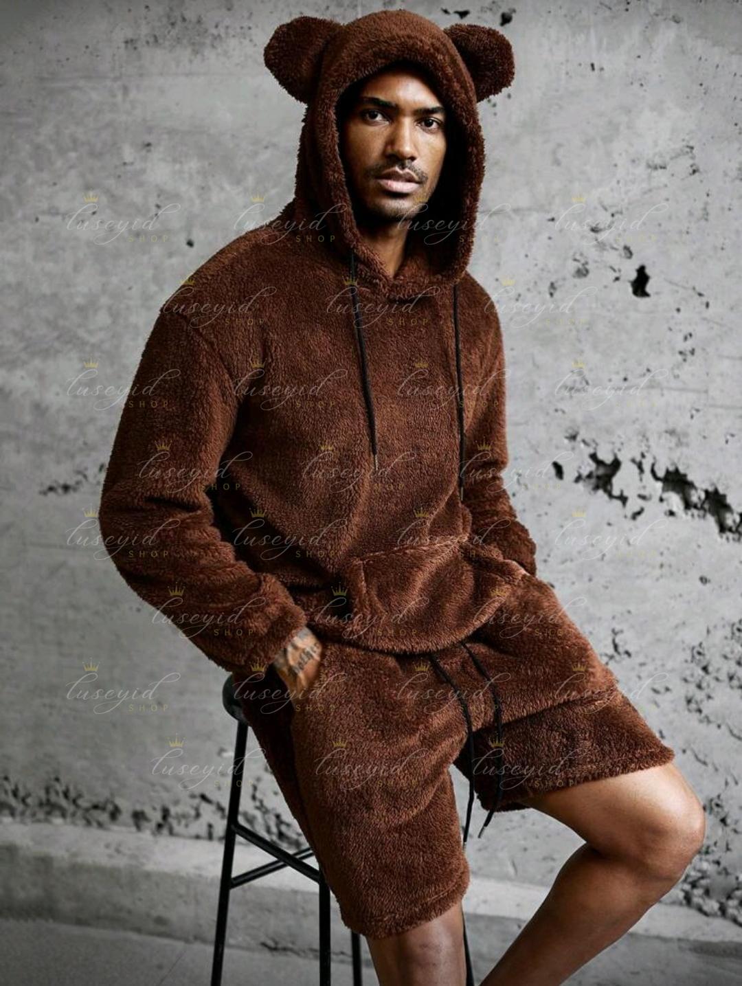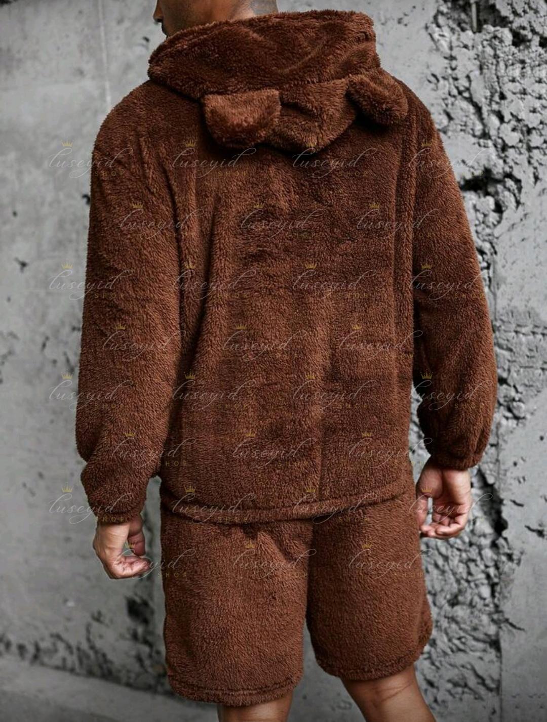 Chillumni 2 piezas Conjunto casual de sudadera con capucha y pantalones cortos de unicolor con diseño de oreja de felpa para otoño e invierno, atuendos acogedores