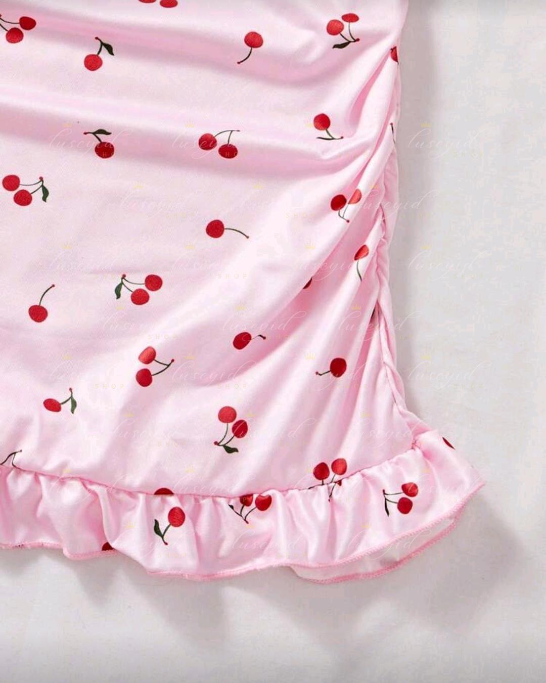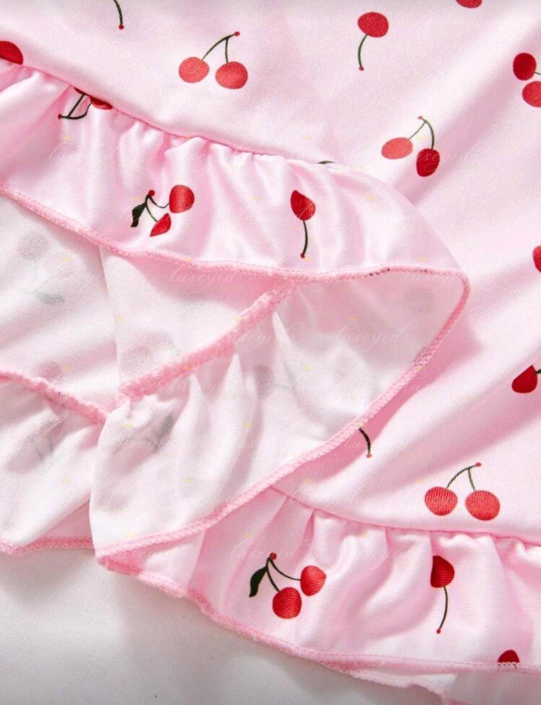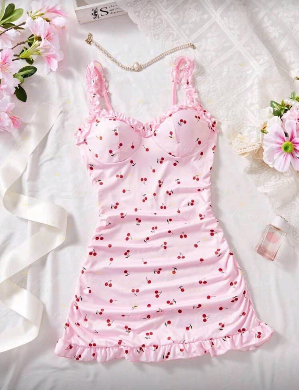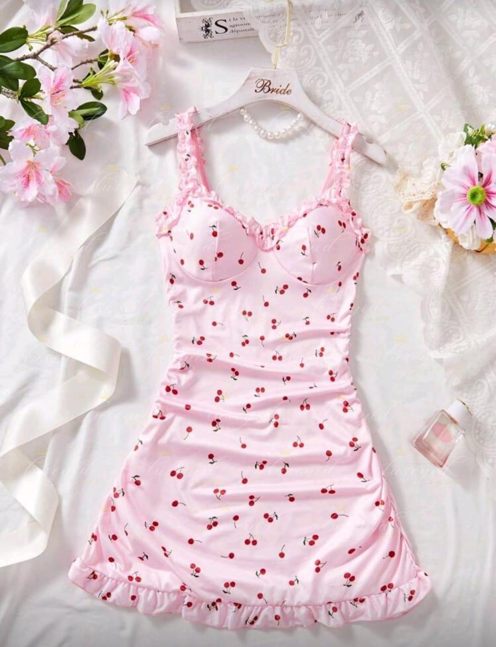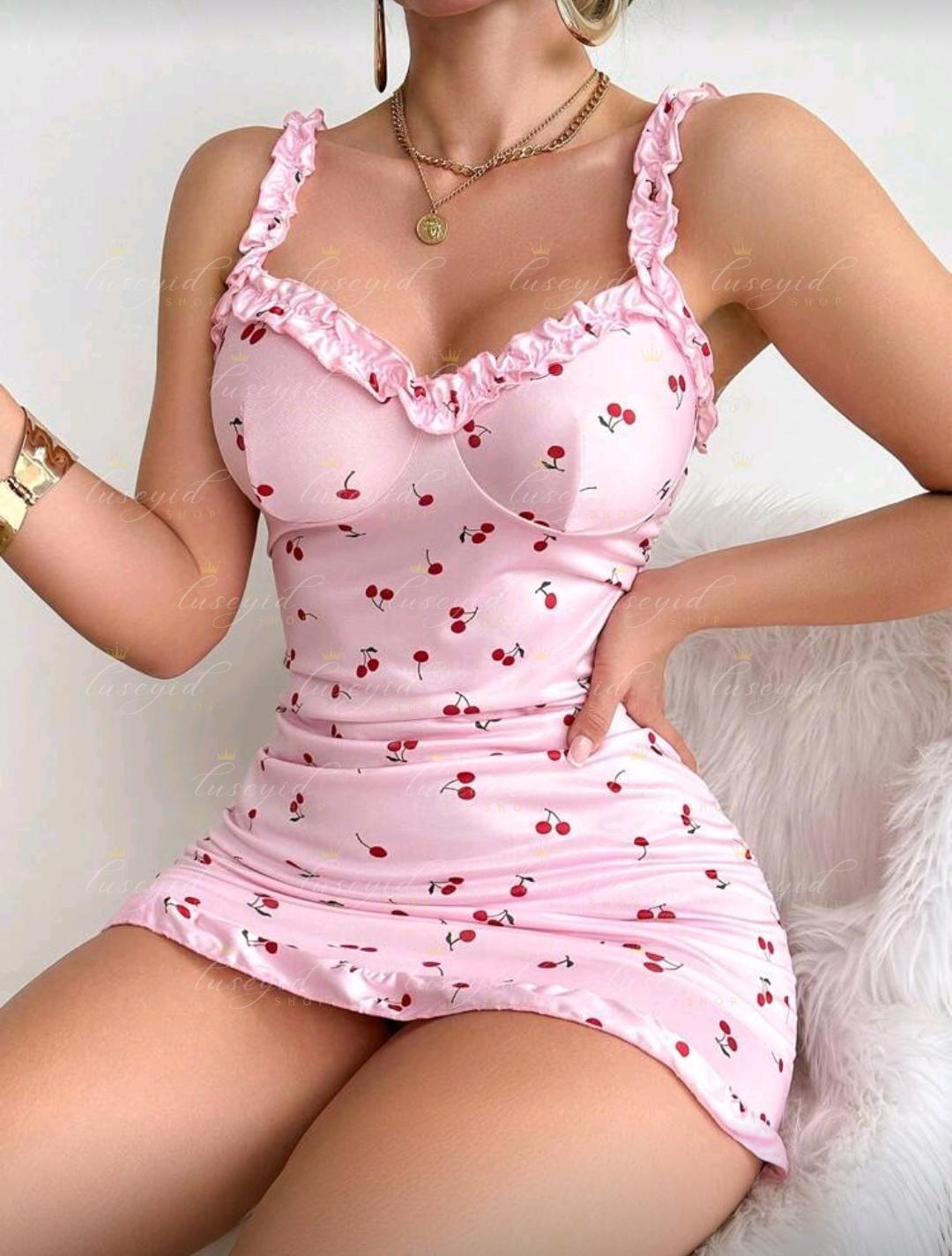 Pijama rosa para mujer, vestido ajustado con volantes y estampado de cerezas, vestido de dormir lindo con ribete de lechuga, camiseta de tirantes con volantes, camisón, vestido deslizante, vestido de lencería sexy, lencería sexy, lencería nupcial, para salir de fiesta
