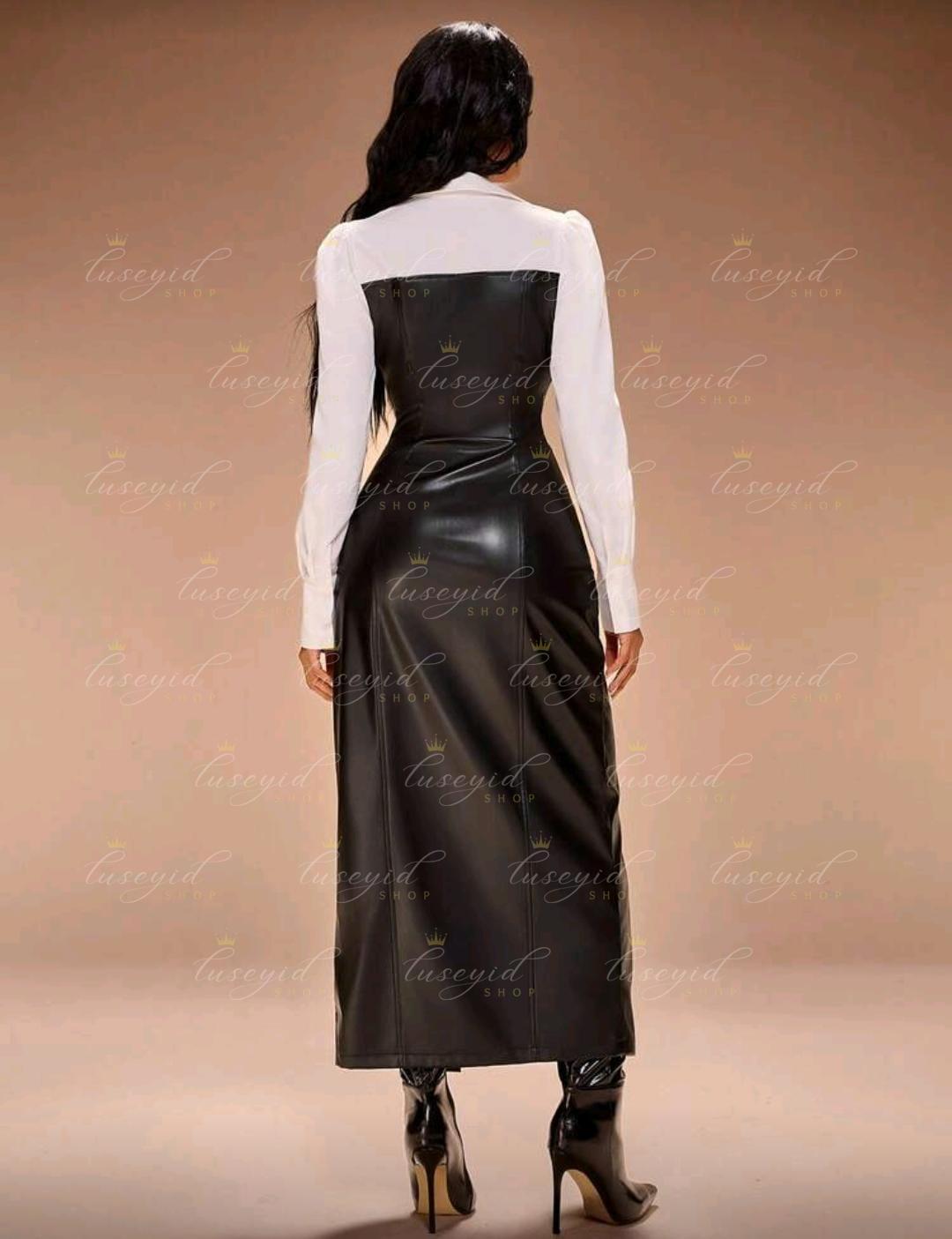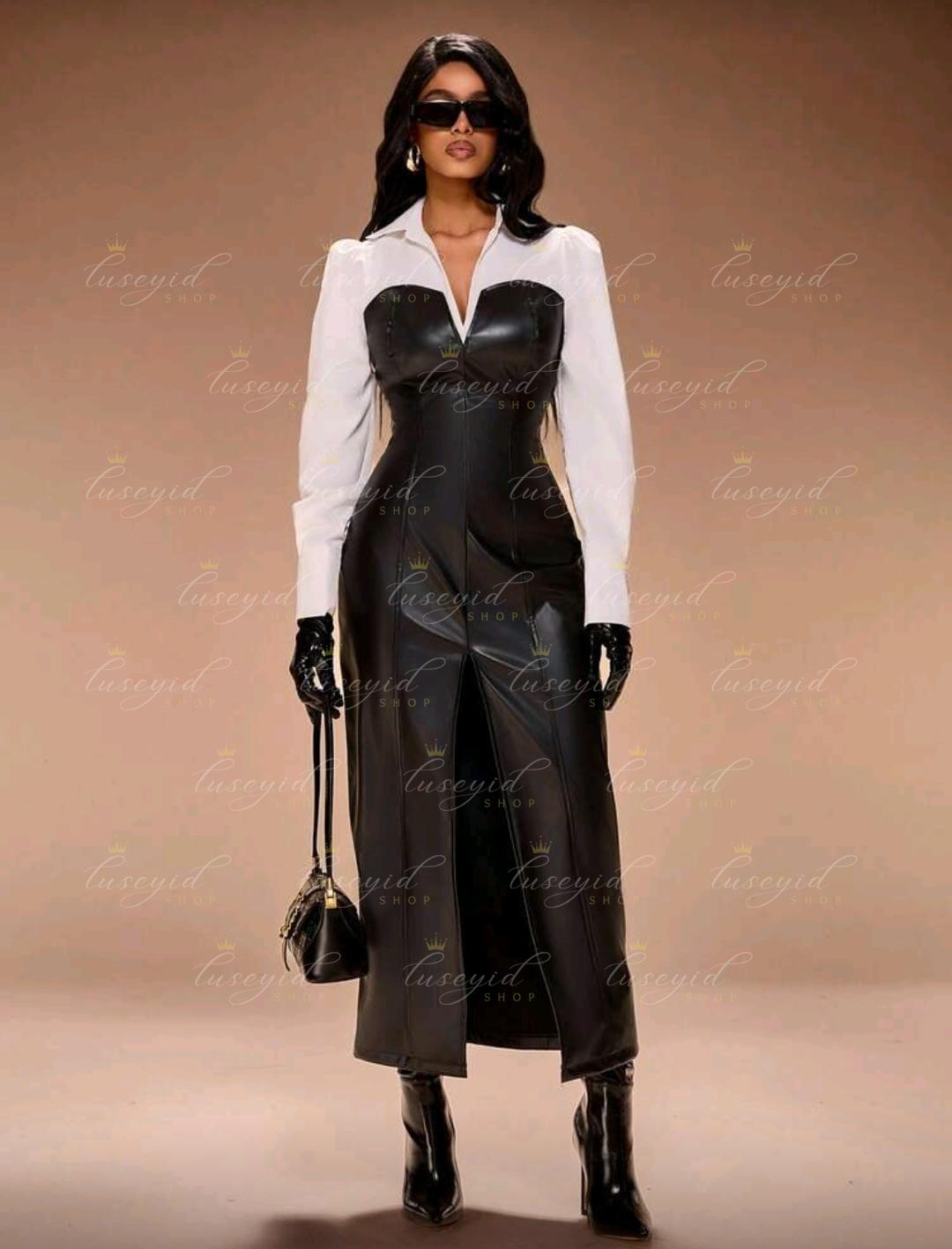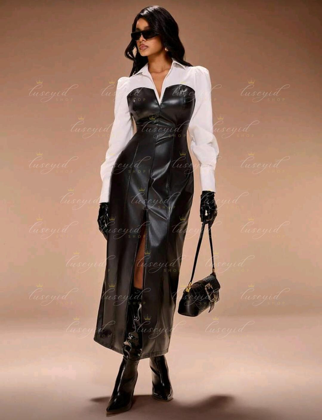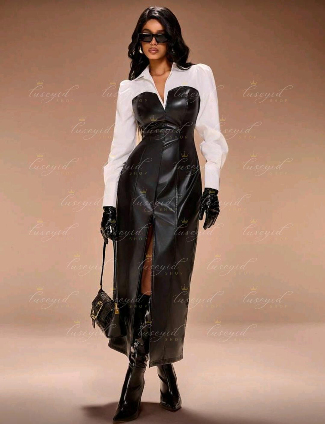 Vestido camisero de manga larga, ajustado y sexy de PU negro para mujer, vestido de negocios casual y elegante adecuado para uso diario, oficina, trayecto y fiesta