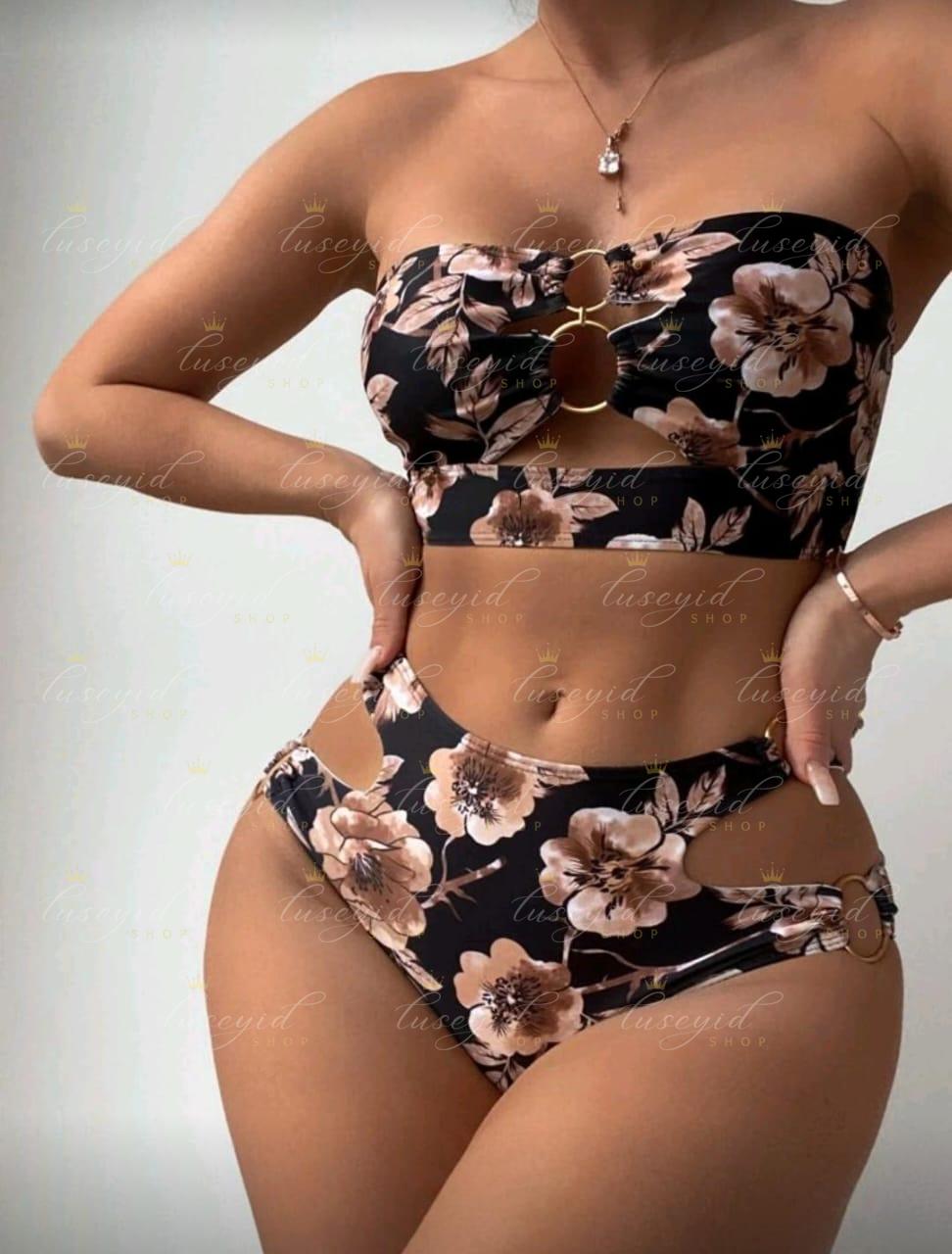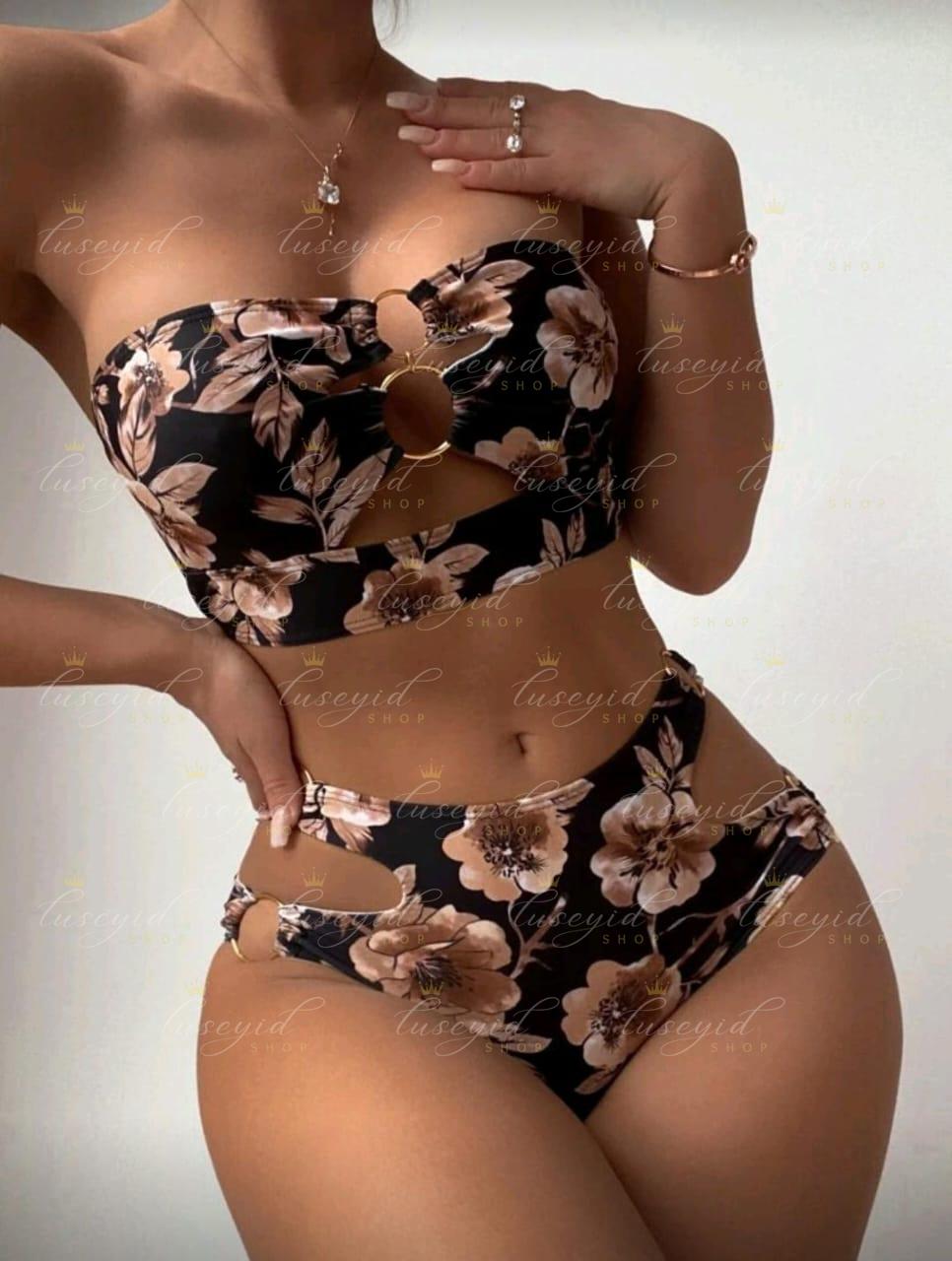 Conjunto de bikini con estampado floral Sujetador de bandeau con aros y traje de baño de 2 piezas con parte inferior hipster recortada