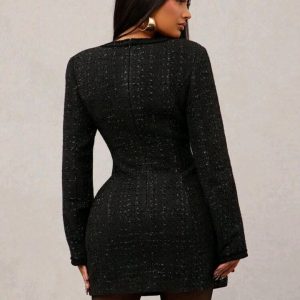 Radiana Vestido ajustado de tweed negro metálico elegante para mujer, vestido de manga larga con cuello cuadrado, atuendo de negocios