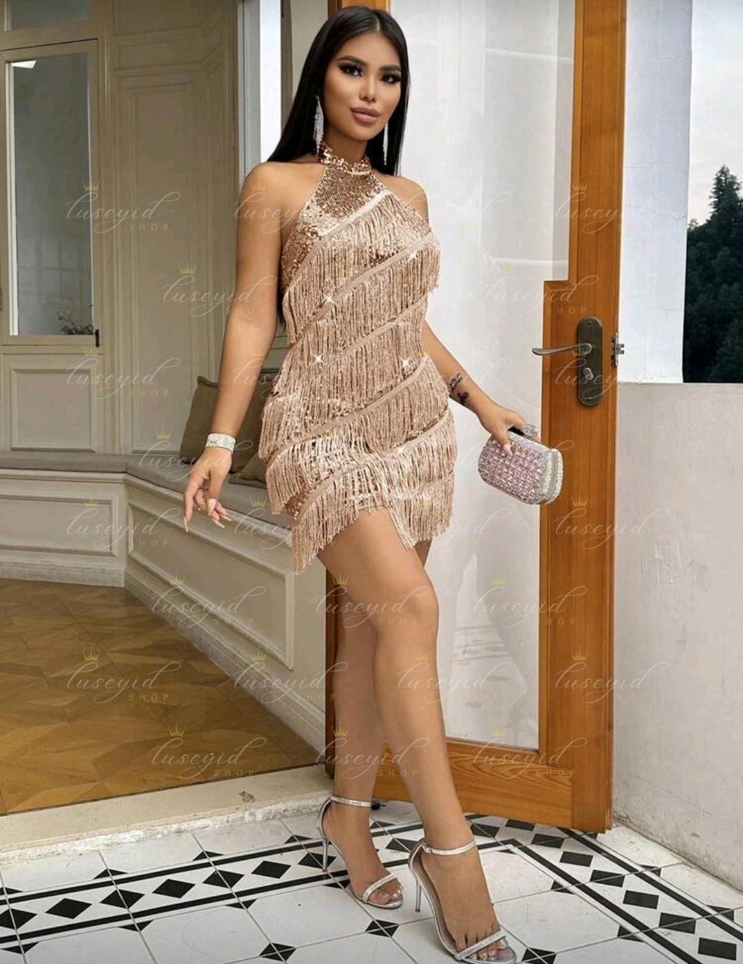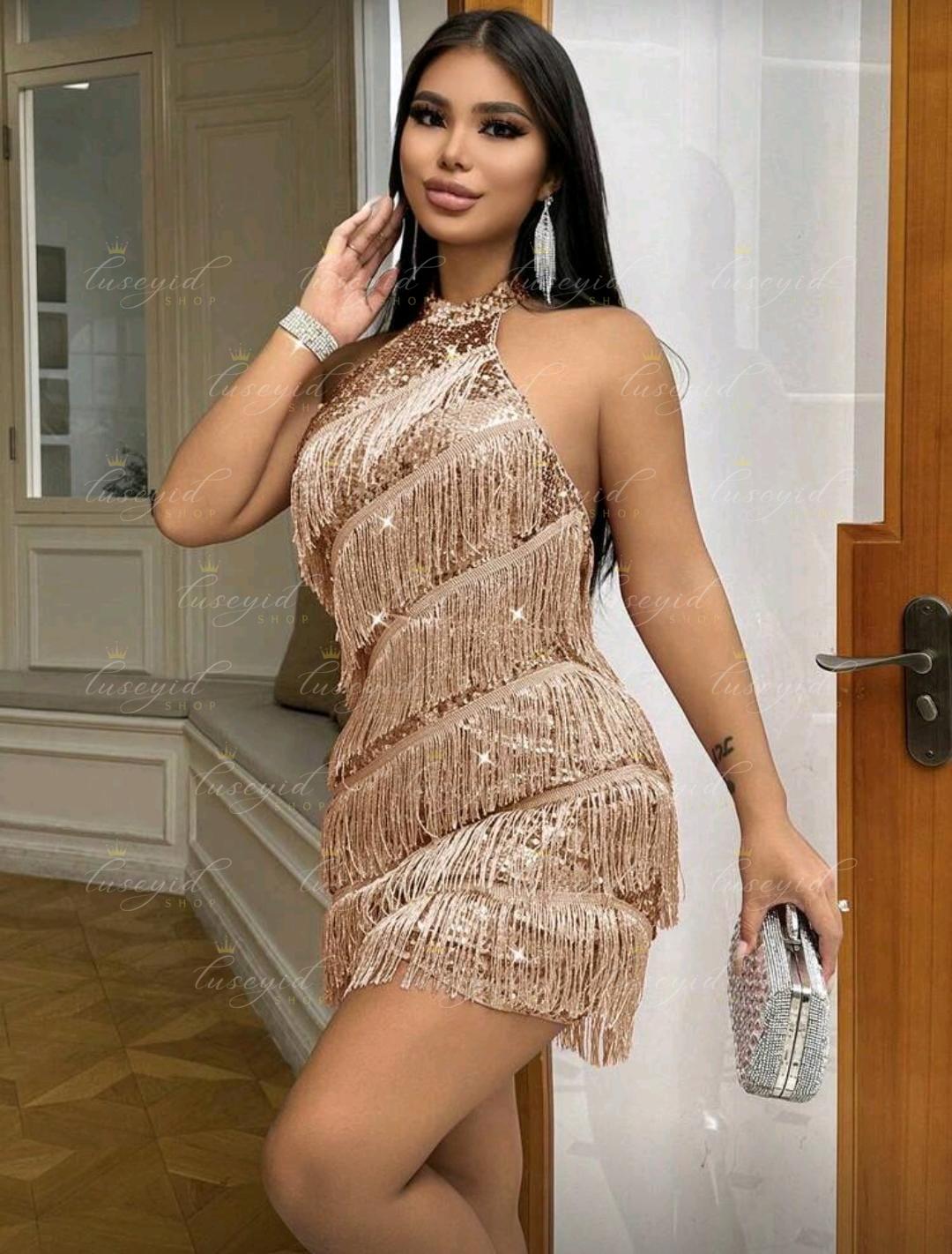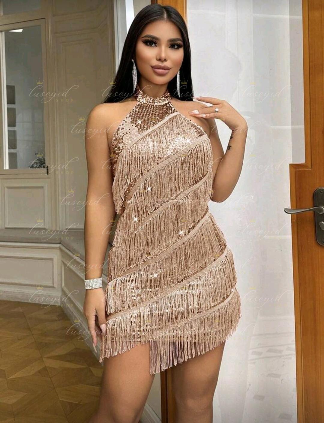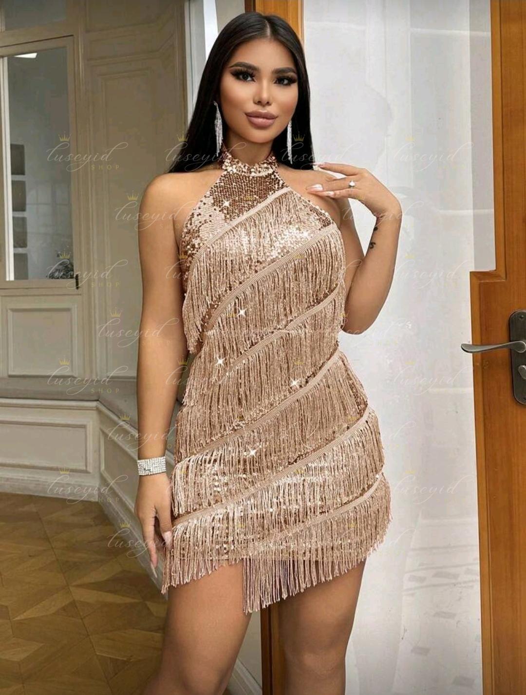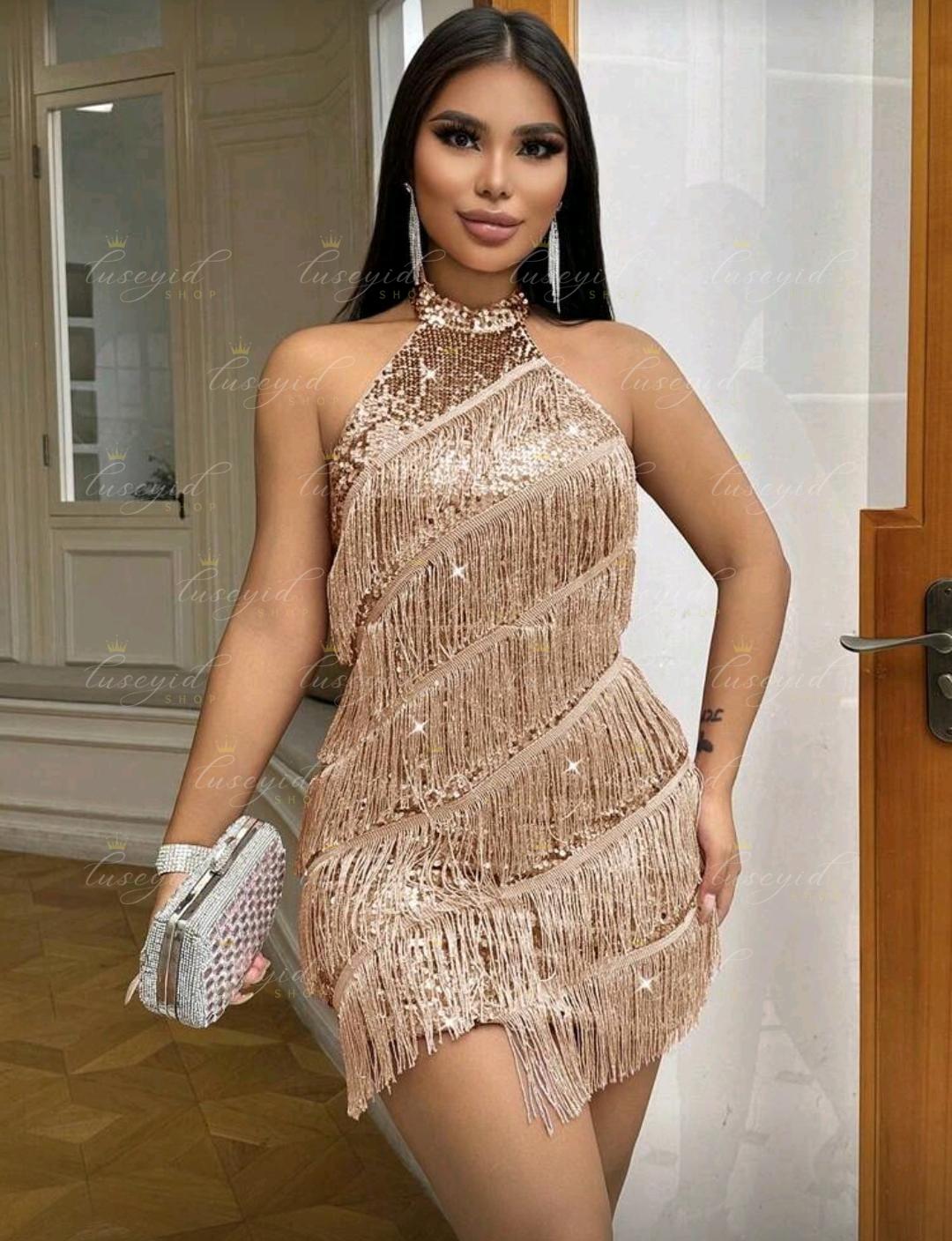 Vestido formal de color champán Nuevo vestido de verano para mujer con hombros descubiertos y lentejuelas ros a, elegante y hermoso vestido de boda, vestido de noche de cintura alta y silueta esbelta, vestido de bola para mujer, adecuado para cóctel, bar, fiesta, evento de noche, invitado de boda